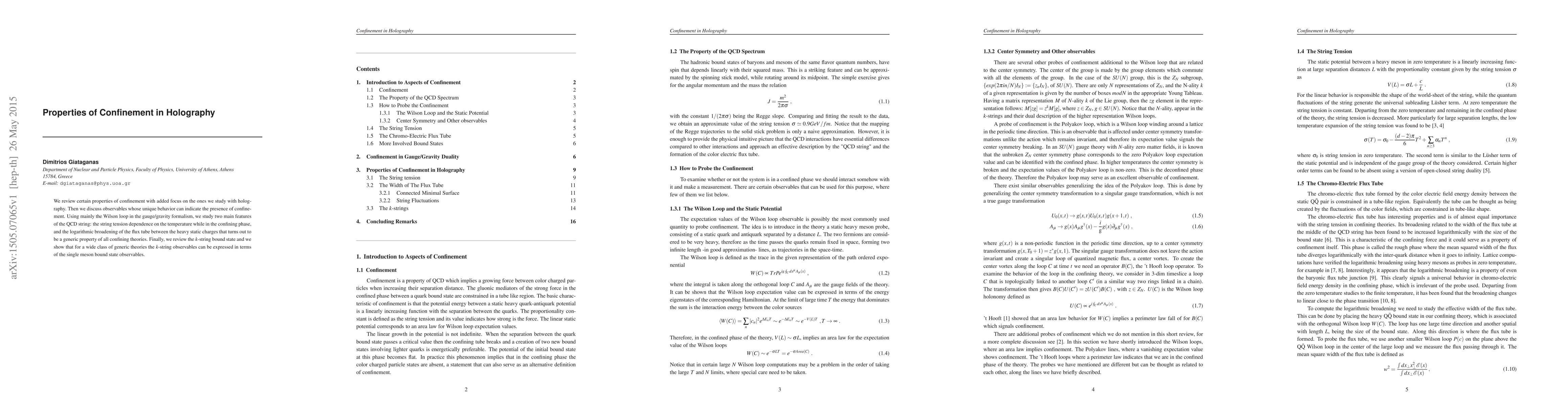 We review certain properties of confinement with added focus on the ones we study with holography. Then we discuss observables whose unique behavior can indicate the presence of confinement. Using mainly the Wilson loop in the gauge/gravity formalism, we study two main features of the QCD string: the string tension dependence on the temperature while in the confining phase, and the logarithmic broadening of the flux tube between the heavy static charges that turns out to be a generic property of all confining theories. Finally, we review the k-string bound state and we show that for a wide class of generic theories the k-string observables can be expressed in terms of the single meson bound state observables.
