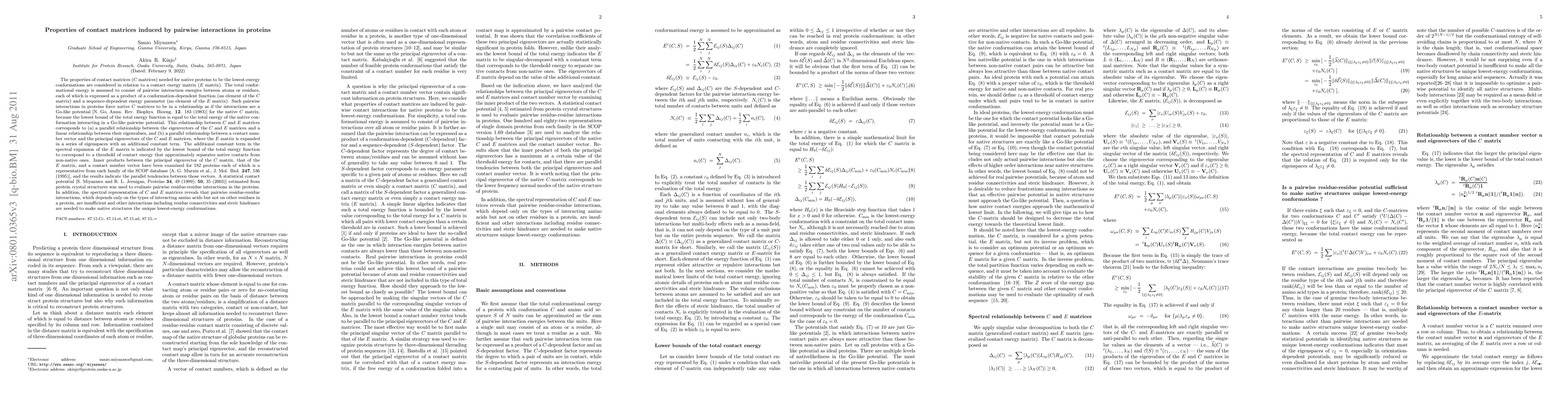 The total conformational energy is assumed to consist of pairwise interaction energies between atoms or residues, each of which is expressed as a product of a conformation-dependent function (an element of a contact matrix, C-matrix) and a sequence-dependent energy parameter (an element of a contact energy matrix, E-matrix). Such pairwise interactions in proteins force native C-matrices to be in a relationship as if the interactions are a Go-like potential [N. Go, Annu. Rev. Biophys. Bioeng. 12. 183 (1983)] for the native C-matrix, because the lowest bound of the total energy function is equal to the total energy of the native conformation interacting in a Go-like pairwise potential. This relationship between C- and E-matrices corresponds to (a) a parallel relationship between the eigenvectors of the C- and E-matrices and a linear relationship between their eigenvalues, and (b) a parallel relationship between a contact number vector and the principal eigenvectors of the C- and E-matrices; the E-matrix is expanded in a series of eigenspaces with an additional constant term, which corresponds to a threshold of contact energy that approximately separates native contacts from non-native ones. These relationships are confirmed in 182 representatives from each family of the SCOP database by examining inner products between the principal eigenvector of the C-matrix, that of the E-matrix evaluated with a statistical contact potential, and a contact number vector. In addition, the spectral representation of C- and E-matrices reveals that pairwise residue-residue interactions, which depends only on the types of interacting amino acids but not on other residues in a protein, are insufficient and other interactions including residue connectivities and steric hindrance are needed to make native structures the unique lowest energy conformations.