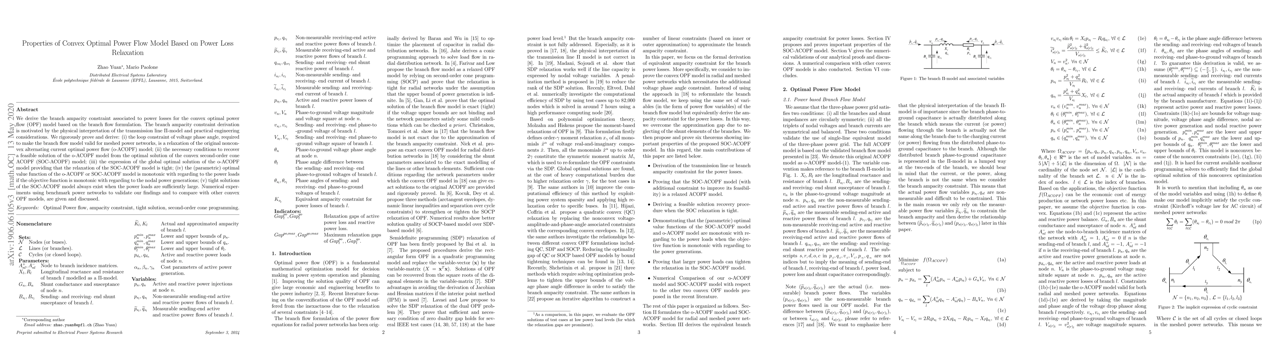 We derive the branch ampacity constraint associated to power losses for the convex optimal power flow (OPF) model based on the branch flow formulation. The branch ampacity constraint derivation is motivated by the physical interpretation of the transmission line {\Pi}-model and practical engineering considerations. We rigorously prove and derive: (i) the loop constraint of voltage phase angle, required to make the branch flow model valid for meshed power networks, is a relaxation of the original nonconvex alternating current optimal power flow (o-ACOPF) model; (ii) the necessary conditions to recover a feasible solution of the o-ACOPF model from the optimal solution of the convex second-order cone ACOPF (SOC-ACOPF) model; (iii) the expression of the global optimal solution of the o-ACOPF model providing that the relaxation of the SOC-ACOPF model is tight; (iv) the (parametric) optimal value function of the o-ACOPF or SOC-ACOPF model is monotonic with regarding to the power loads if the objective function is monotonic with regarding to the nodal power generations; (v) tight solutions of the SOC-ACOPF model always exist when the power loads are sufficiently large. Numerical experiments using benchmark power networks to validate our findings and to compare with other convex OPF models, are given and discussed.