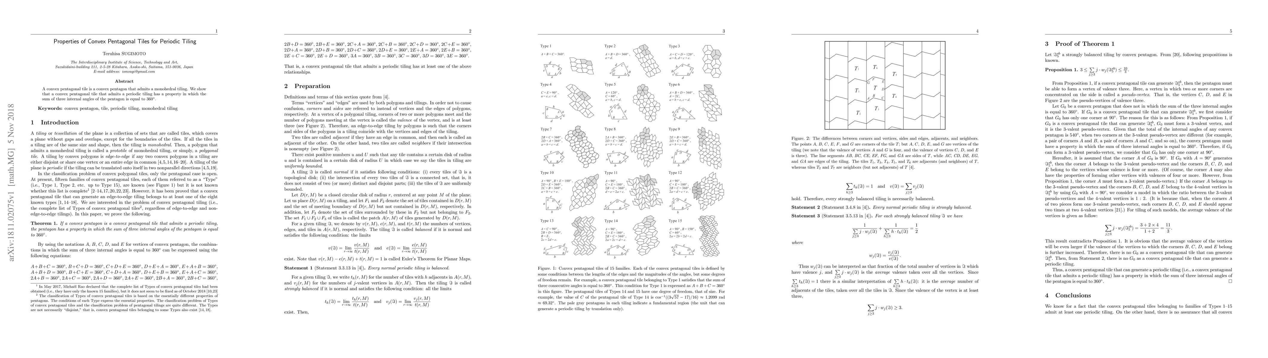 Summary: This paper investigates convex pentagonal tiles that can form periodic tilings, demonstrating that such tiles possess a property where the sum of three of their internal angles equals 360 degrees.