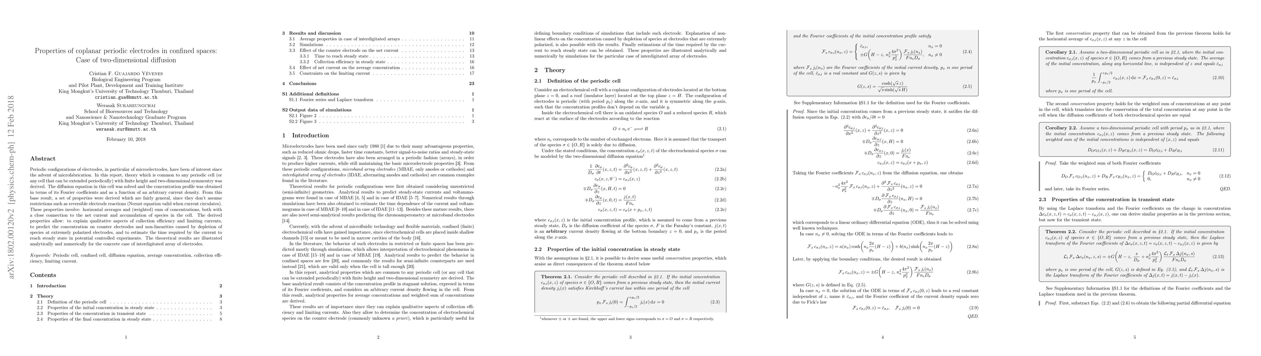 This paper derives a theoretical framework for analyzing the properties of coplanar periodic electrodes in confined spaces, focusing on two-dimensional diffusion. It provides a general set of properties for concentration profiles, explaining collection efficiency, limiting currents, and predicting concentration and time to steady state, illustrated through an interdigitated electrode array.