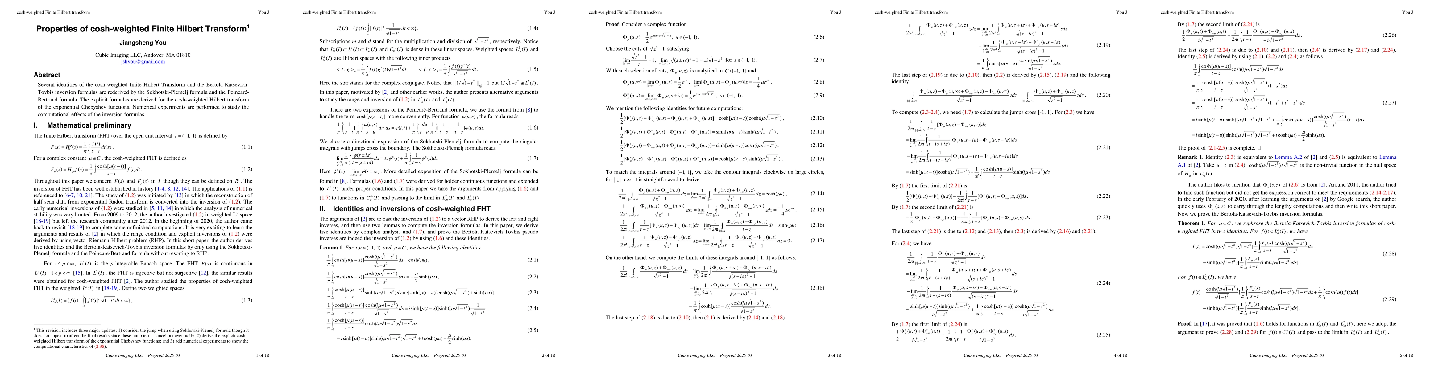 Several identities of the cosh-weighted finite Hilbert Transform and the Bertola-Katsevich-Tovbis inversion formulas are rederived by the Sokhotski-Plemelj formula and the Poincare-Bertrand formula. The explicit formulas are derived for the cosh-weighted Hilbert transform of the exponential Chebyshev functions. Numerical experiments are performed to study the computational effects of the inversion formulas.