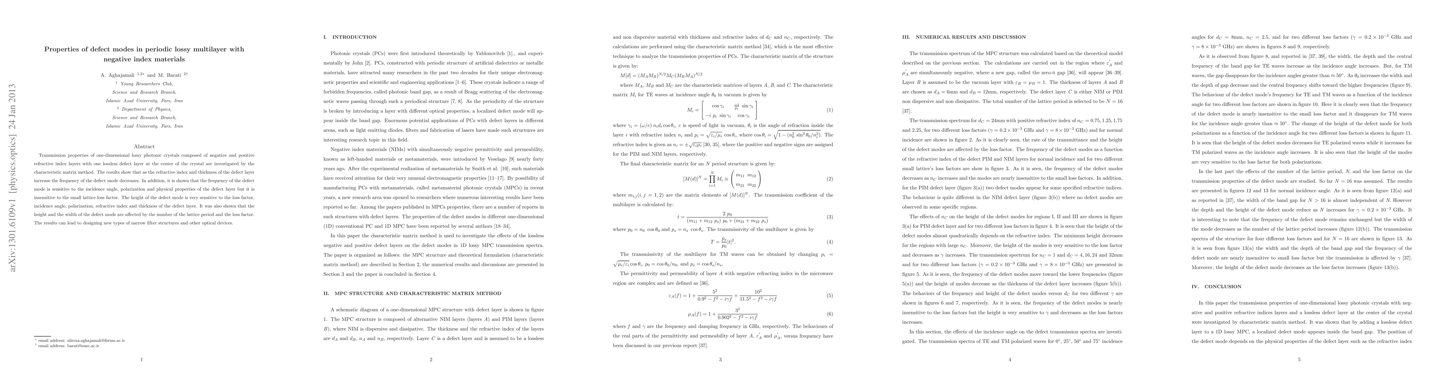 This paper investigates the transmission properties of lossy photonic crystals with negative and positive refractive index layers, focusing on defect modes. The study reveals that defect mode frequency decreases with increasing defect layer refractive index and thickness, while its height is highly sensitive to various factors including loss, incidence angle, and polarization. The findings suggest potential for designing advanced optical filters and devices.
