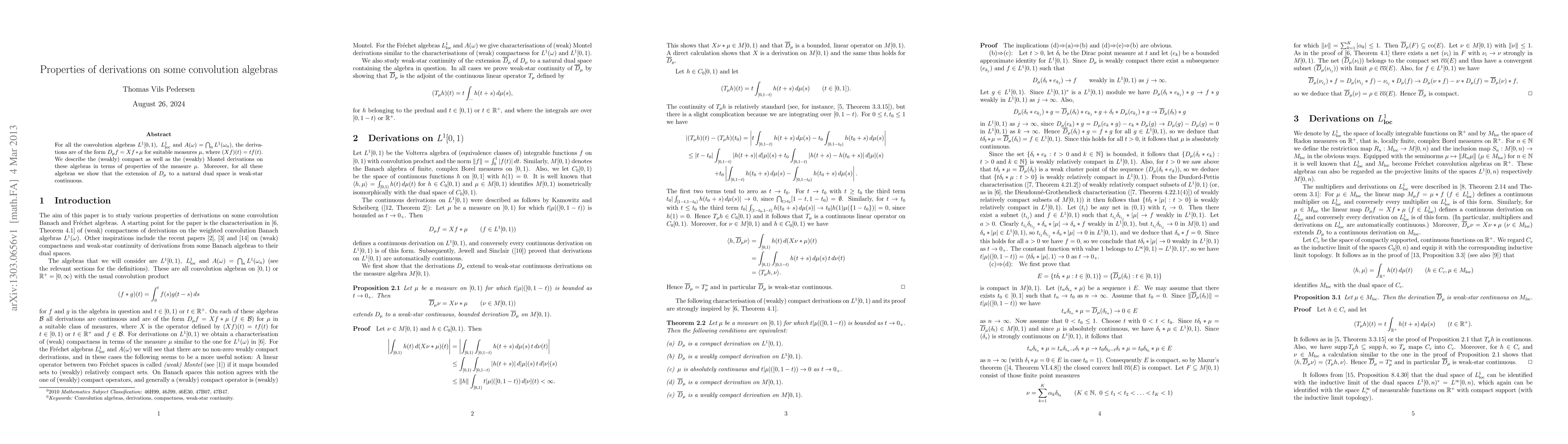 This research paper investigates derivations on specific convolution algebras, finding that they can be represented as a measure multiplication with a suitable function, and characterizing the properties of such measures.