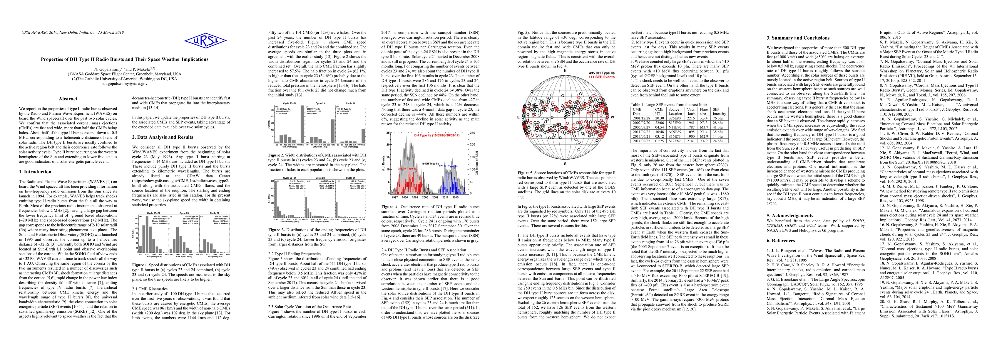 Type II radio bursts show properties of fast and wide coronal mass ejections (CMEs) with half extending to low frequencies, indicating solar energetic particle events.