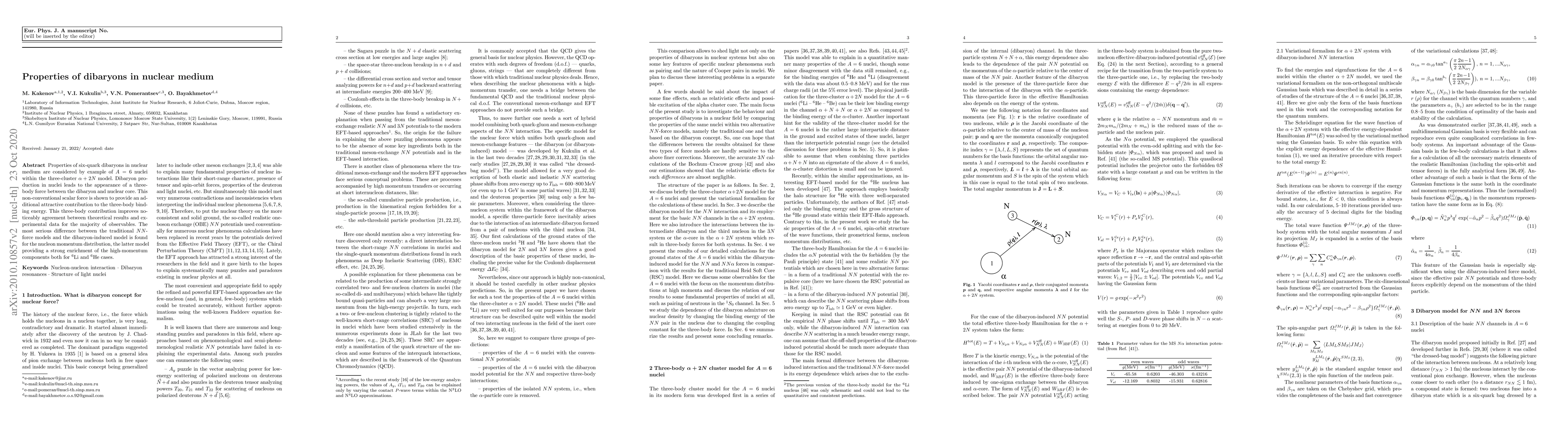 Properties of six-quark dibaryons in nuclear medium are considered by example of $A=6$ nuclei within the three-cluster $\alpha+2N$ model. Dibaryon production in nuclei leads to the appearance of a three-body force between the dibaryon and nuclear core. This non-conventional scalar force is shown to provide an additional attractive contribution to the three-body binding energy. This three-body contribution improves noticeably agreement between theoretical results and experimental data for the majority of observables. The most serious difference between the traditional $NN$-force models and the dibaryon-induced model is found for the nucleon momentum distribution, the latter model providing a strong enrichment of the high-momentum components both for $^6$Li and $^6$He cases.
