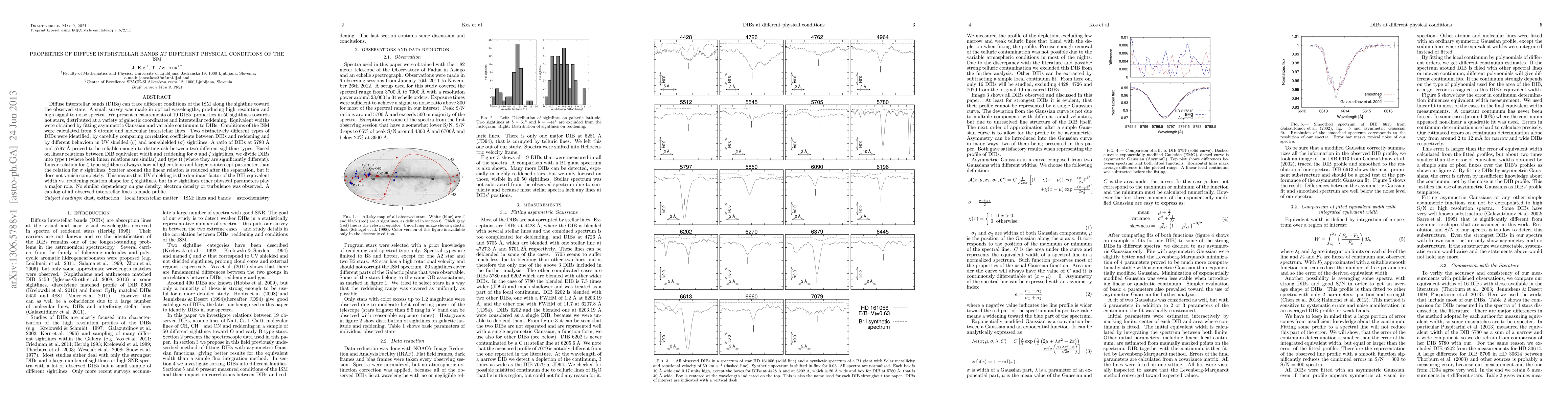 Diffuse interstellar bands (DIBs) can trace different conditions of the ISM along the sightline toward the observed stars. A small survey was made in optical wavelengths, producing high resolution and high signal to noise spectra. We present measurements of 19 DIBs' properties in 50 sightlines towards hot stars, distributed at a variety of galactic coordinates and interstellar reddening. Equivalent widths were obtained by fitting asymmetric Gaussian and variable continuum to DIBs. Conditions of the ISM were calculated from 8 atomic and molecular interstellar lines. Two distinctively different types of DIBs were identified, by carefully comparing correlation coefficients between DIBs and reddening and by different behaviour in UV shielded ($\zeta$) and non-shielded ($\sigma$) sightlines. A ratio of DIBs at 5780 \AA\ and~5797 \AA\ proved to be reliable enough to distinguish between two different sightline types. Based on linear relations between DIB equivalent width and reddening for $\sigma$ and $\zeta$ sightlines, we divide DIBs into type {\sc i} (where both linear relations are similar) and type {\sc ii} (where they are significantly different). Linear relation for $\zeta$ type sightlines always show a higher slope and larger x-intercept parameter than the relation for $\sigma$ sightlines. Scatter around the linear relation is reduced after the separation, but it does not vanish completely. This means that UV shielding is the dominant factor of the DIB equivalent width vs.\ reddening relation shape for $\zeta$ sightlines, but in $\sigma$ sightlines other physical parameters play a major role. No similar dependency on gas density, electron density or turbulence was observed. A catalog of all observed interstellar lines is made public.
