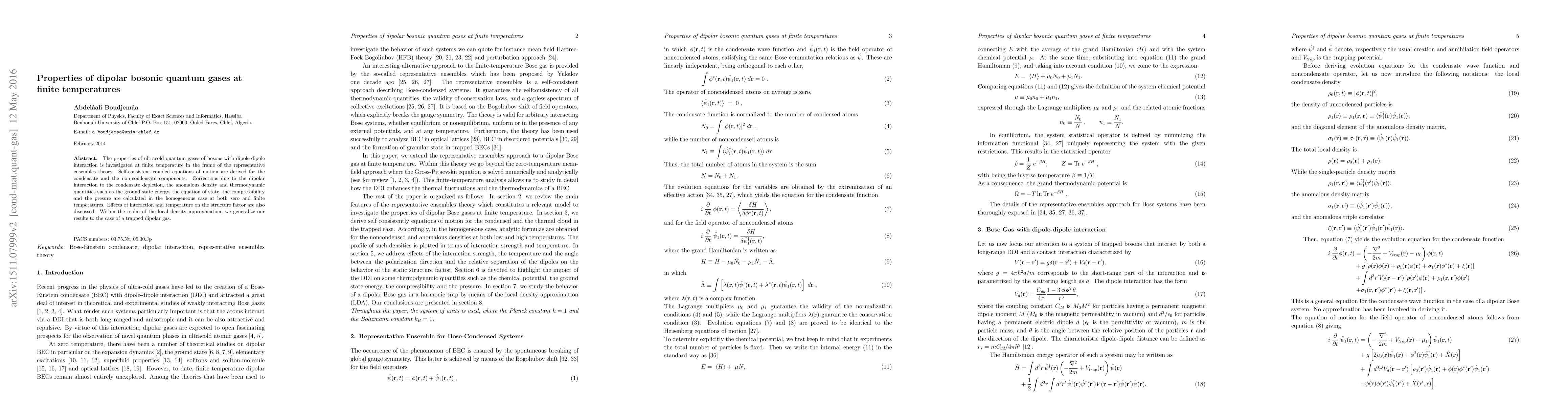 The properties of ultracold quantum gases of bosons with dipole-dipole interaction is investigated at finite temperature in the frame of the representative ensembles theory. Self-consistent coupled equations of motion are derived for the condensate and the non-condensate components. Corrections due to the dipolar interaction to the condensate depletion, the anomalous density and thermodynamic quantities such as the ground state energy, the equation of state, the compressibility and the presure are calculated in the homogeneous case at both zero and finite temperatures. Effects of interaction and temperature on the structure factor are also discussed. Within the realm of the local density approximation, we generalize our results to the case of a trapped dipolar gas.