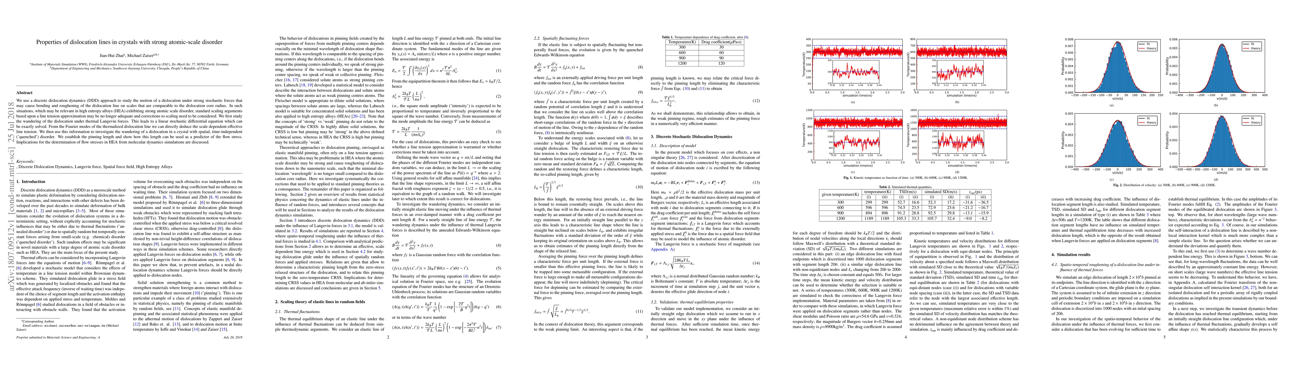 This paper employs discrete dislocation dynamics to explore dislocation behavior in crystals with significant atomic-scale disorder, revealing that standard line tension approximations are inadequate. It establishes a pinning length that predicts flow stress, with implications for understanding high entropy alloys from molecular dynamics simulations.