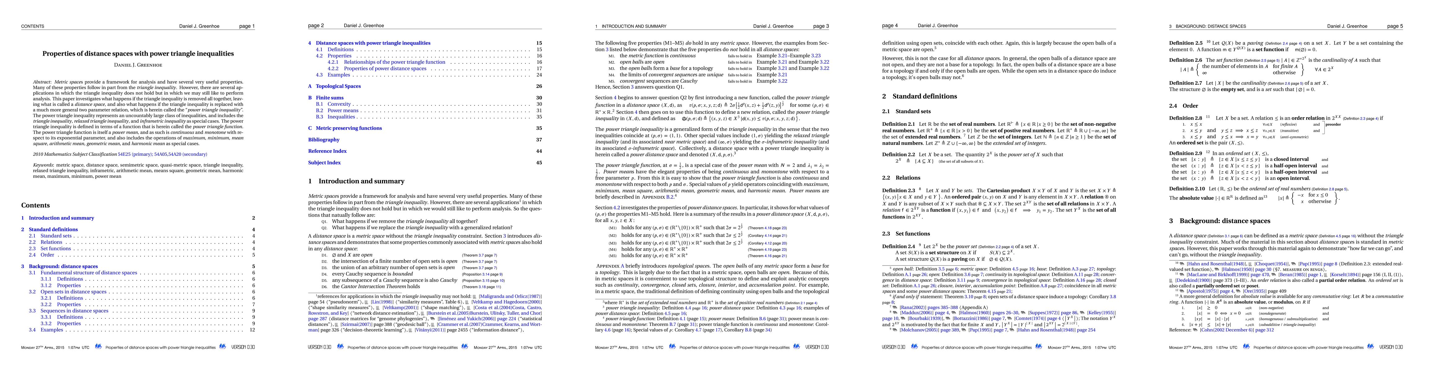 Metric spaces provide a framework for analysis and have several very useful properties. Many of these properties follow in part from the triangle inequality. However, there are several applications in which the triangle inequality does not hold but in which we may still like to perform analysis. This paper investigates what happens if the triangle inequality is removed all together, leaving what is called a distance space, and also what happens if the triangle inequality is replaced with a much more general two parameter relation, which is herein called the "power triangle inequality". The power triangle inequality represents an uncountably large class of inequalities, and includes the triangle inequality, relaxed triangle inequality, and inframetric inequality as special cases. The power triangle inequality is defined in terms of a function that is herein called the "power triangle function". The power triangle function is itself a power mean, and as such is continuous and monotone with respect to its exponential parameter, and also includes the operations of maximum, minimum, mean square, arithmetic mean, geometric mean, and harmonic mean as special cases.