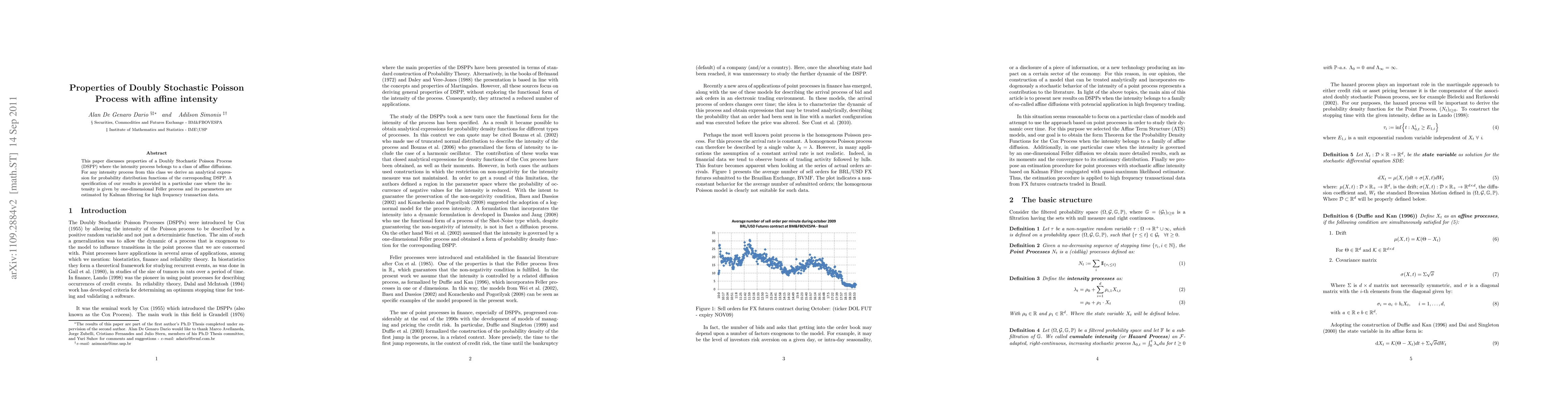 This paper explores a Doubly Stochastic Poisson Process (DSPP) with an affine intensity process, deriving analytical expressions for its probability distribution functions. It also applies these results to a one-dimensional Feller process, estimating parameters using Kalman filtering on high-frequency transaction data.