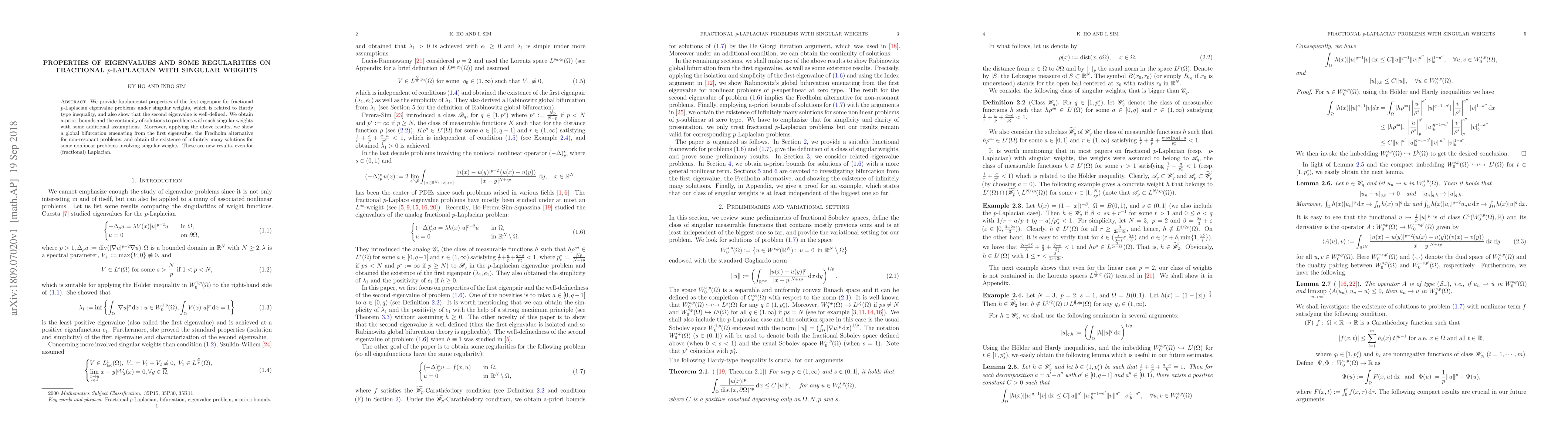 We provide fundamental properties of the first eigenpair for fractional $p$-Laplacian eigenvalue problems under singular weights, which is related to Hardy type inequality, and also show that the second eigenvalue is well-defined. We obtain a-priori bounds and the continuity of solutions to problems with such singular weights with some additional assumptions. Moreover, applying the above results, we show a global bifurcation emenating from the first eigenvalue, the Fredholm alternative for non-resonant problems, and obtain the existence of infinitely many solutions for some nonlinear problems involving singular weights. These are new results, even for (fractional) Laplacian.