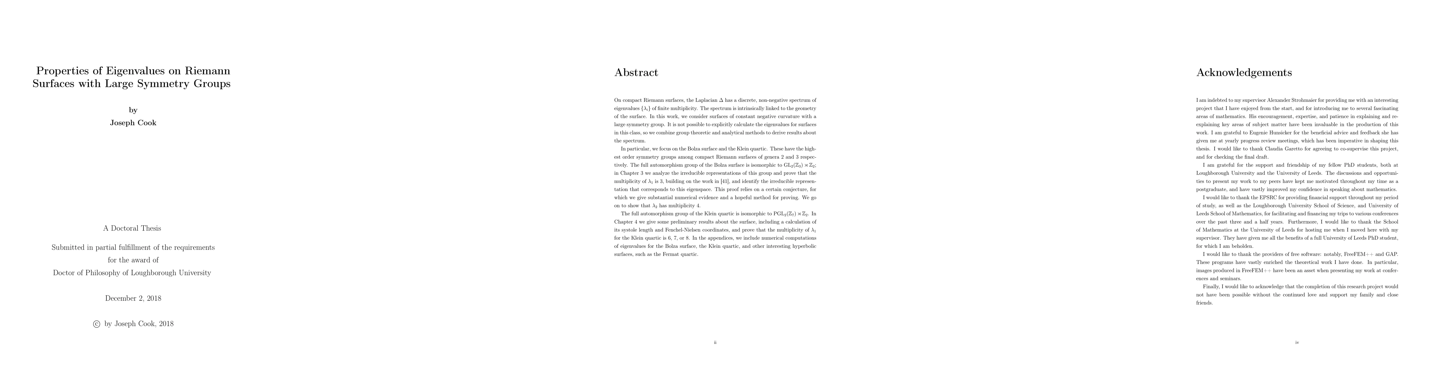 On compact Riemann surfaces, the Laplacian has a discrete, non-negative spectrum of eigenvalues of finite multiplicity. The spectrum is intrinsically linked to the geometry of the surface. In this work, we consider surfaces of constant negative curvature with a large symmetry group. It is not possible to calculate explicitly the eigenvalues for surfaces in this class, so we combine group theoretic and analytical methods to derive results about the spectrum. In particular, we focus on the Bolza surface and the Klein quartic. These have the highest order symmetry groups among compact Riemann surfaces of genera 2 and 3 respectively. We analyse the irreducible representations of the full isomorphism group of the Bolza surface and prove that the multiplicity of the first positive eigenvalue is 3, building on the work of Jenni, and identify the irreducible representation that corresponds to this eigenspace. This proof relies on a certain conjecture, for which we give substantial numerical evidence and a hopeful method for proving. We go on to show that the second distinct positive eigenvalue has multiplicity 4.