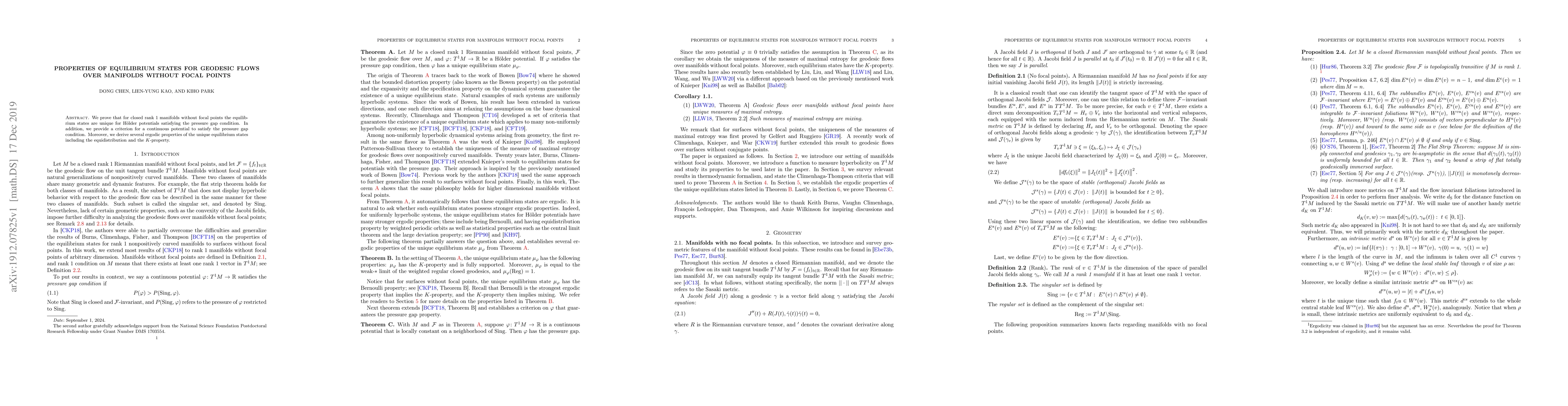 Researchers prove that for closed manifolds without focal points, unique equilibrium states exist for certain types of potential functions, providing new insights into ergodic properties of geodesic flows.