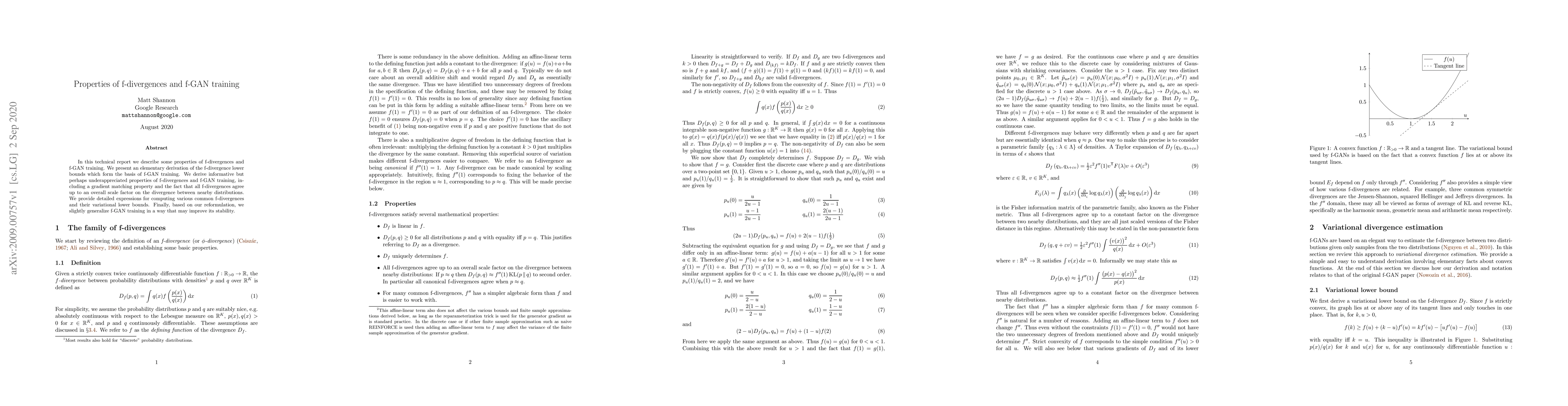 In this technical report we describe some properties of f-divergences and f-GAN training. We present an elementary derivation of the f-divergence lower bounds which form the basis of f-GAN training. We derive informative but perhaps underappreciated properties of f-divergences and f-GAN training, including a gradient matching property and the fact that all f-divergences agree up to an overall scale factor on the divergence between nearby distributions. We provide detailed expressions for computing various common f-divergences and their variational lower bounds. Finally, based on our reformulation, we slightly generalize f-GAN training in a way that may improve its stability.