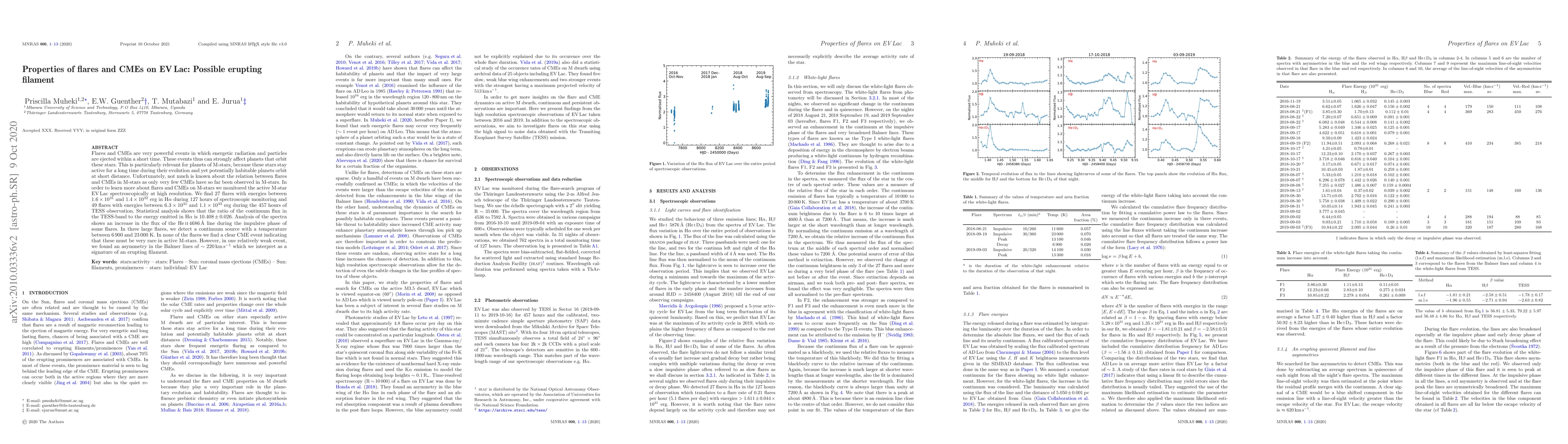 Flares and CMEs are very powerful events in which energetic radiation and particles are ejected within a short time. These events thus can strongly affect planets that orbit these stars. This is particularly relevant for planets of M-stars, because these stars stay active for a long time during their evolution and yet potentially habitable planets orbit at short distance. Unfortunately, not much is known about the relation between flares and CMEs in M-stars as only very few CMEs have so far been observed in M-stars. In order to learn more about flares and CMEs on M-stars we monitored the active M-star EV Lac spectroscopically at high resolution. We find 27 flares with energies between 1.6E31 and 1.4E32 erg in Halpha during 127 hours of spectroscopic monitoring and 49 flares with energies between 6.3E31 and 1.1E33 erg during the 457 hours of TESS observation. Statistical analysis shows that the ratio of the continuum flux in the TESS-band to the energy emitted in Halpha is 10.408 +/- 0.026. Analysis of the spectra shows an increase in the flux of the He II 4686 {\AA} line during the impulsive phase of some flares. In three large flares, we detect a continuum source with a temperature between 6 900 and 23 000 K. In none of the flares we find a clear CME event indicating that these must be very rare in active M-stars. However, in one relatively weak event, we found an asymmetry in the Balmer lines of ~220 km/s which we interpret as a signature of an erupting filament.