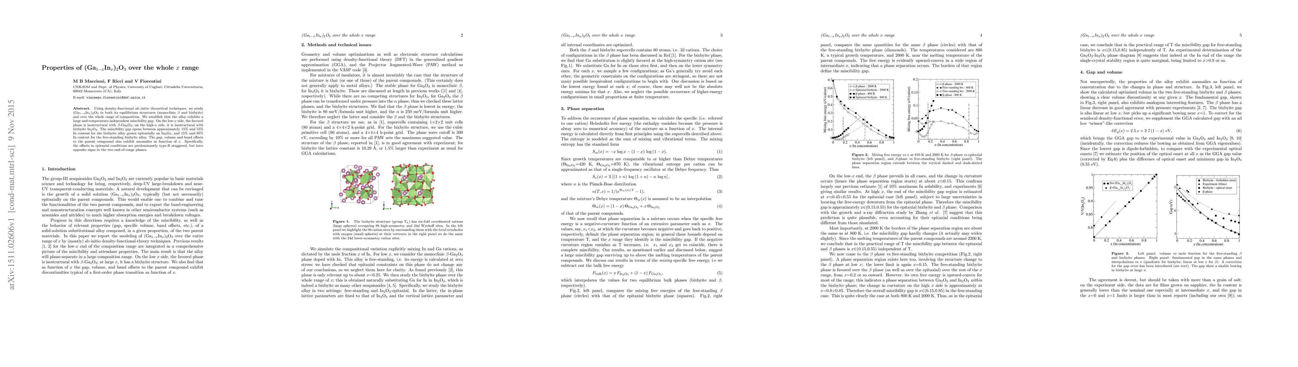 Using density-functional ab initio theoretical techniques, we study (Ga$_{1-x}$In$_x$)$_2$O$_3$ in both its equilibrium structures (monoclinic $\beta$ and bixbyite) and over the whole range of composition. We establish that the alloy exhibits a large and temperature-independent miscibility gap. On the low-$x$ side, the favored phase is isostructural with $\beta$-Ga$_2$O$_3$; on the high-$x$ side, it is isostructural with bixbyite In$_2$O$_3$. The miscibility gap opens between approximately 15\% and 55\% In content for the bixbyite alloy grown epitaxially on In$_2$O$_3$, and 15\% and 85\% In content for the free-standing bixbyite alloy. The gap, volume and band offsets to the parent compound also exhibit anomalies as function of $x$. Specifically, the offsets in epitaxial conditions are predominantly type-B staggered, but have opposite signs in the two end-of-range phases.