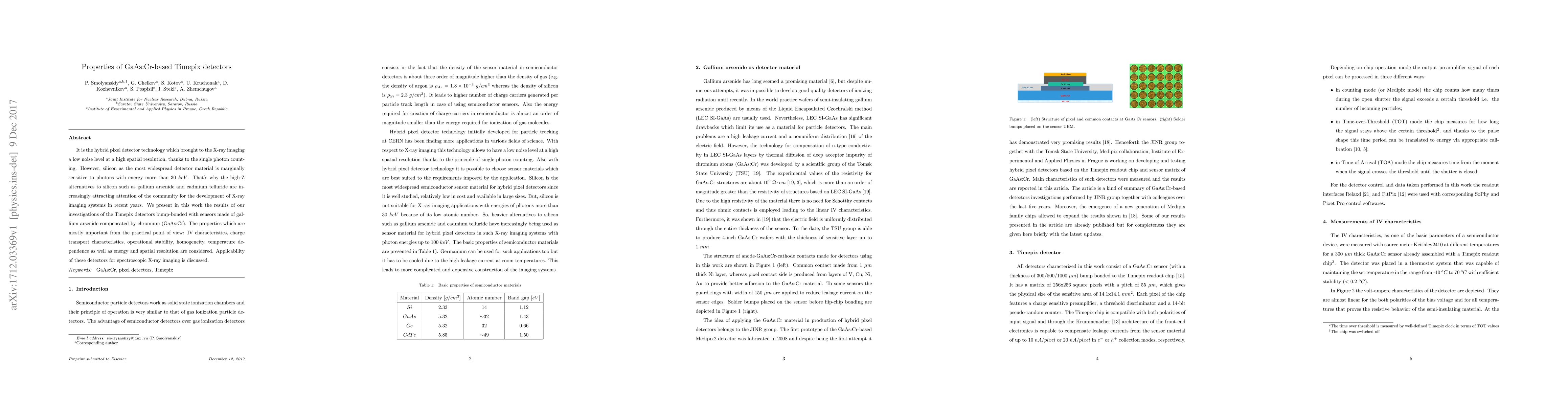 This paper investigates the properties of GaAs:Cr-based Timepix detectors, focusing on their IV characteristics, charge transport, operational stability, and resolution. The study highlights their potential for high-energy X-ray imaging, offering a low-noise, high-resolution alternative to silicon-based detectors.