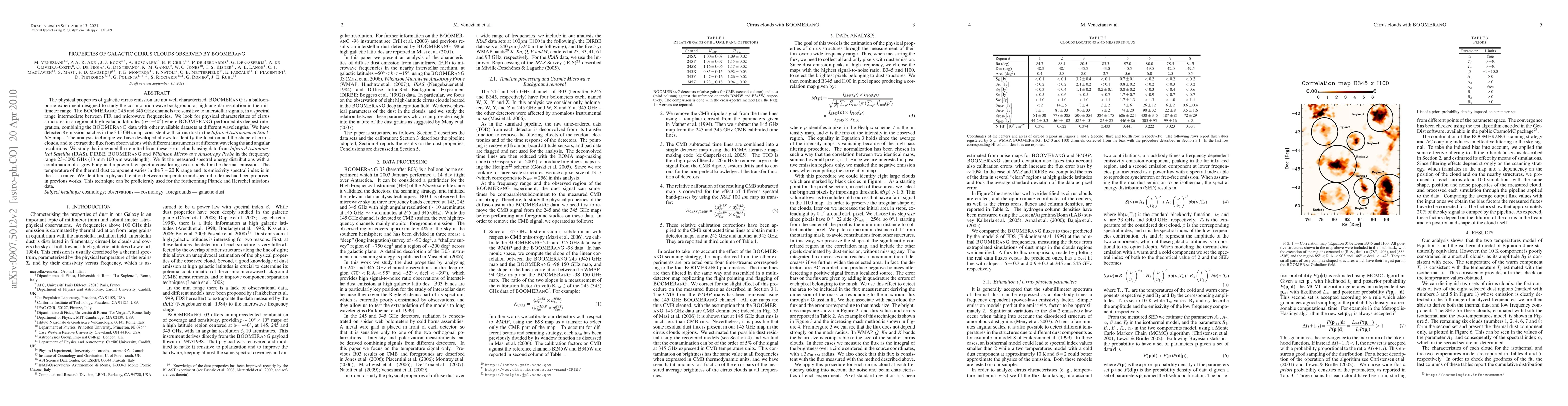 The BOOMERanG experiment identified and characterized galactic cirrus clouds at high galactic latitudes, combining data from multiple wavelengths to study their spectral energy distributions. The cirrus clouds exhibit temperatures ranging from 7 to 20 K and emissivity spectral indices from 1 to 5, revealing a consistent physical relation between temperature and spectral index.