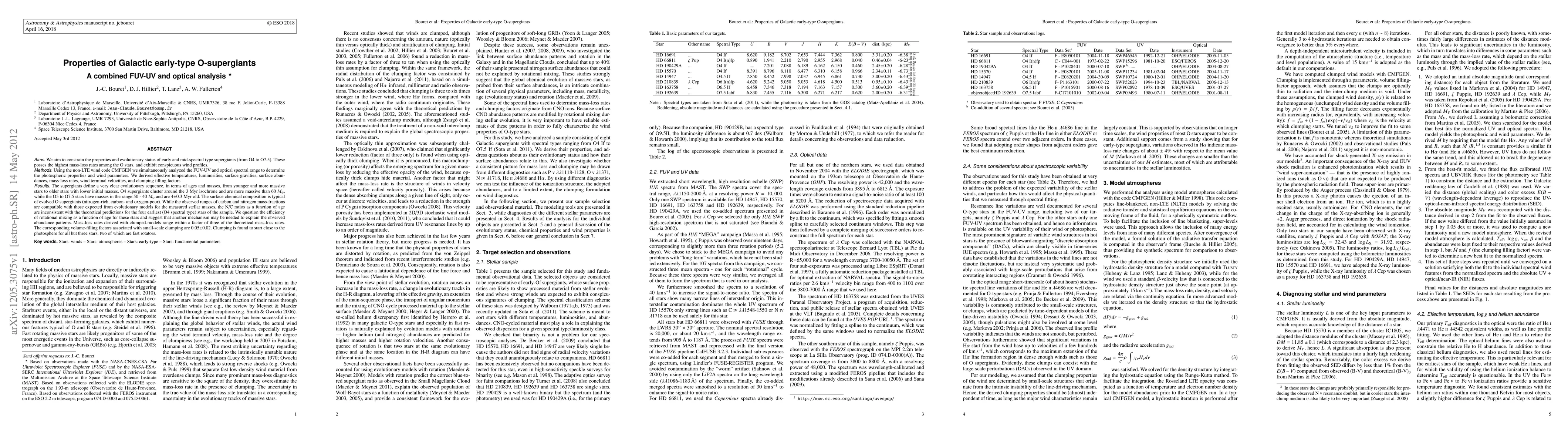 We aim to constrain the properties and evolutionary status of early and mid-spectral type supergiants (from O4 to O7.5). These posses the highest mass-loss rates among the O stars, and exhibit conspicuous wind profiles. Using the non-LTE wind code CMFGEN, we simultaneously analyzed the FUV-UV and optical spectral range to determine the photospheric properties and wind parameters. We derived effective temperatures, luminosities, surface gravities, surface abundances, mass-loss rates, wind terminal velocities, and clumping filling factors. The supergiants define a very clear evolutionary sequence, in terms of ages and masses, from younger and more massive stars to older stars with lower initial masses. O4 supergiants cluster around the 3 Myr isochrone and are more massive than 60 Msun, while the O5 to O7.5 stars have masses in the range 50 - 40 Msun and are 4 +/- 0.3 Myr old. The surface chemical composition is typical of evolved O supergiants (nitrogen-rich, carbon- and oxygen-poor). While the observed ranges of carbon and nitrogen mass-fractions are compatible with those expected from evolutionary models for the measured stellar masses, the N/C ratios as a function of age are inconsistent with the theoretical predictions for the four earliest (O4 spectral type) stars of the sample. We question the efficiency of rotational mixing as a function of age for these stars and suggest that another mechanism may be needed to explain the observed abundance patterns. Mass-loss rates derived with clumped-models range within a factor of three of the theoretical mass-loss rates. The corresponding volume-filling factors associated with small-scale clumping are 0.05 +/- 0.02. Clumping is found to start close to the photosphere for all but three stars, two of which are fast rotators.