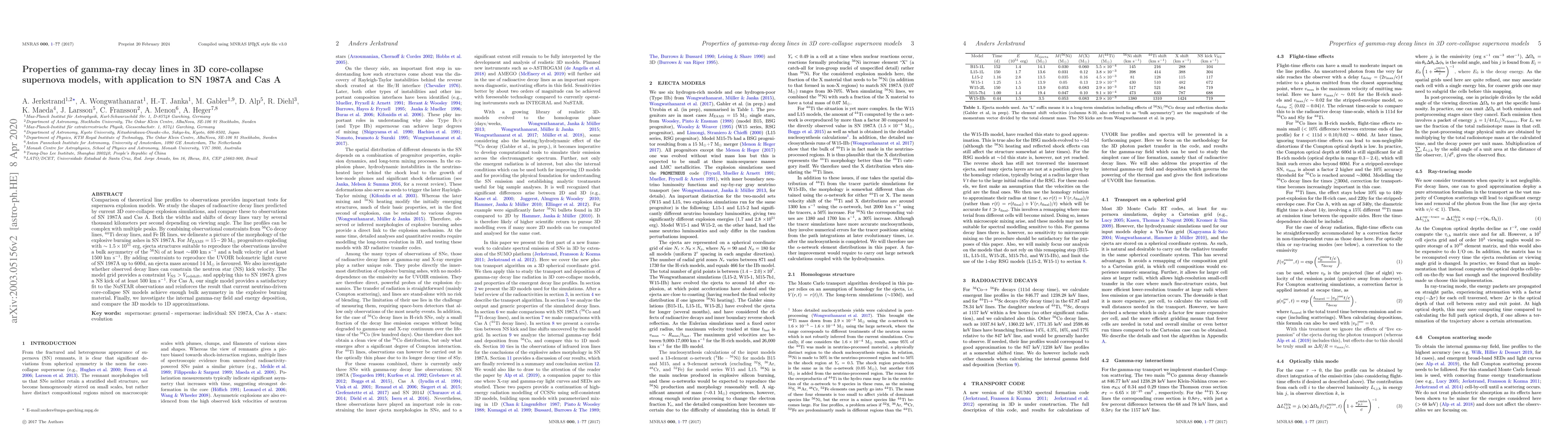 Researchers studied gamma-ray decay lines in 3D core-collapse supernovae models, comparing them to observations of SN 1987A and Cas A, and found that the line profiles can reveal details about the explosive burning ashes and neutron star kick velocity.