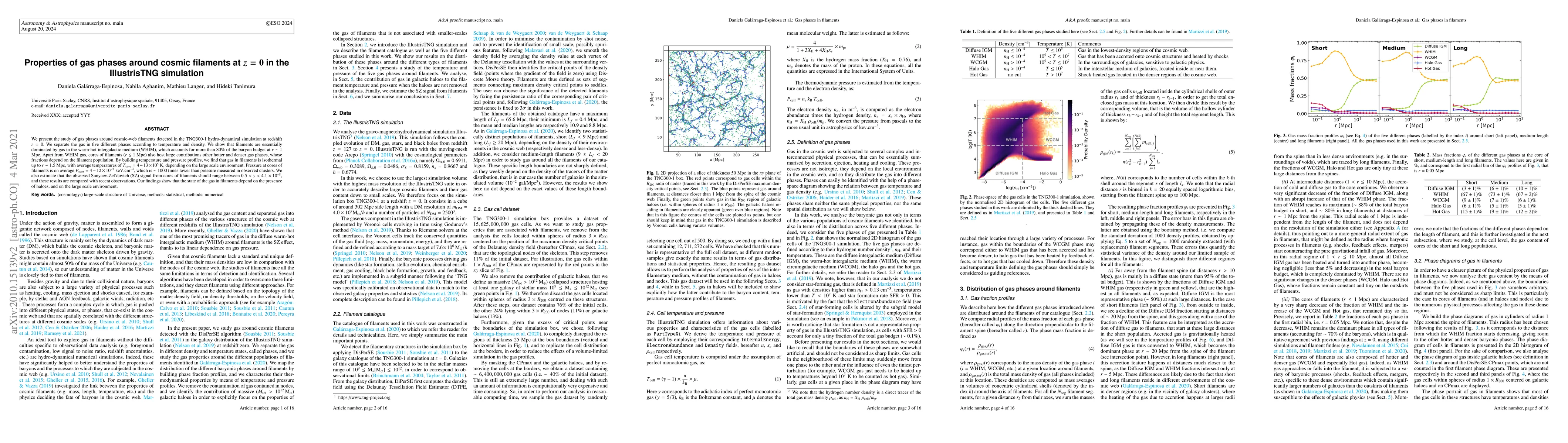 This study investigates gas phases around cosmic filaments at z=0 in the Illustris-TNG simulation, categorizing gas into five phases based on temperature and density. It finds that filaments are predominantly composed of warm-hot intergalactic medium (WHIM), which constitutes over 80% of the baryon budget at $r \sim 1$ Mpc.