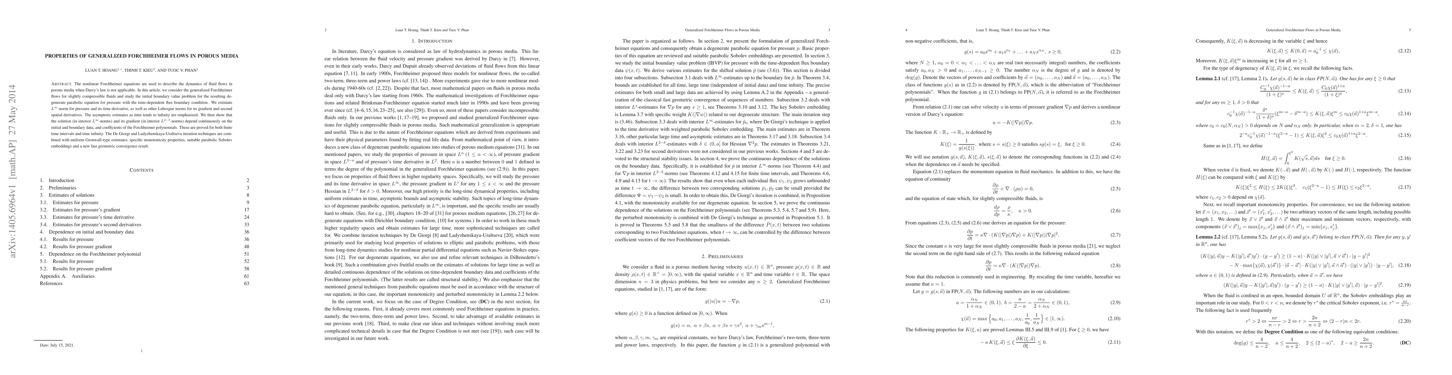 The nonlinear Forchheimer equations are used to describe the dynamics of fluid flows in porous media when Darcy's law is not applicable. In this article, we consider the generalized Forchheimer flows for slightly compressible fluids and study the initial boundary value problem for the resulting degenerate parabolic equation for pressure with the time-dependent flux boundary condition. We estimate $L^\infty$-norm for pressure and its time derivative, as well as other Lebesgue norms for its gradient and second spatial derivatives. The asymptotic estimates as time tends to infinity are emphasized. We then show that the solution (in interior $L^\infty$-norms) and its gradient (in interior $L^{2-\delta}$-norms) depend continuously on the initial and boundary data, and coefficients of the Forchheimer polynomials. These are proved for both finite time intervals and time infinity. The De Giorgi and Ladyzhenskaya-Uraltseva iteration techniques are combined with uniform Gronwall-type estimates, specific monotonicity properties, suitable parabolic Sobolev embeddings and a new fast geometric convergence result.