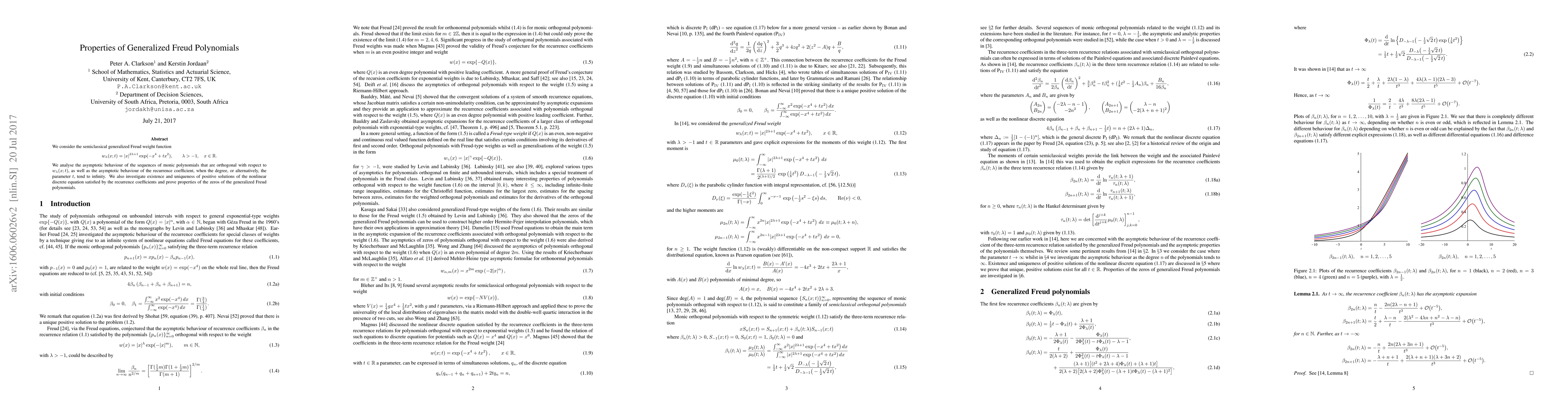 This paper examines the asymptotic properties of generalized Freud orthogonal polynomials defined by the weight function \(w_{\lambda}(x;t)\), focusing on the behavior of the polynomial sequences and recurrence coefficients as the degree or parameter \(t\) approaches infinity. It also explores the existence and uniqueness of positive solutions for the associated nonlinear difference equation and investigates the properties of the zeros of these polynomials.