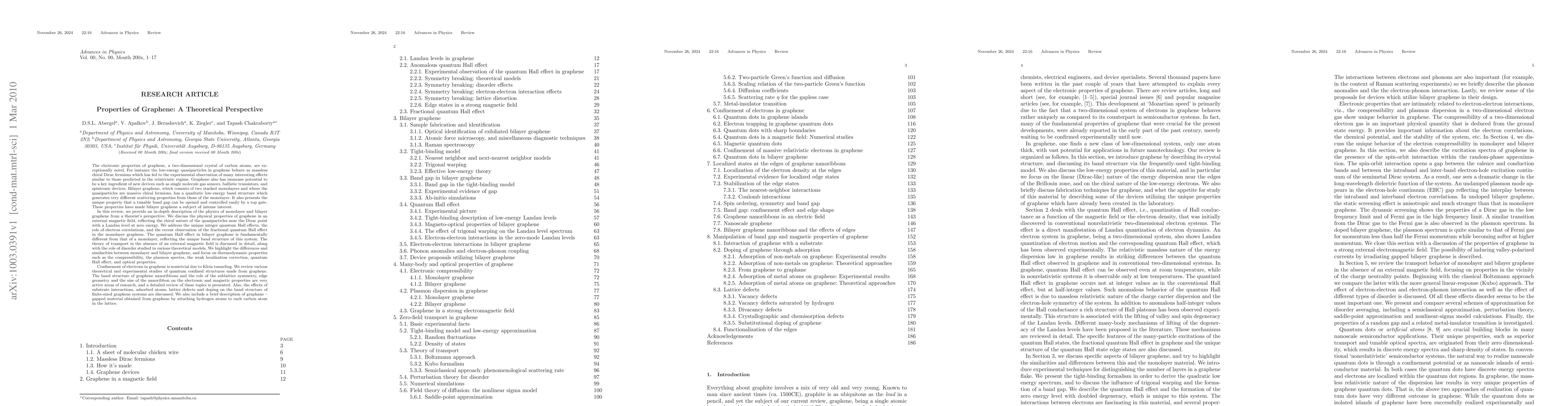 This paper offers a comprehensive theoretical review of graphene's properties, focusing on monolayer and bilayer forms. It covers quantum Hall effects, electron correlations, transport theories, and the influence of confinement, substrate interactions, and defects on graphene's band structure, while also briefly introducing graphane.