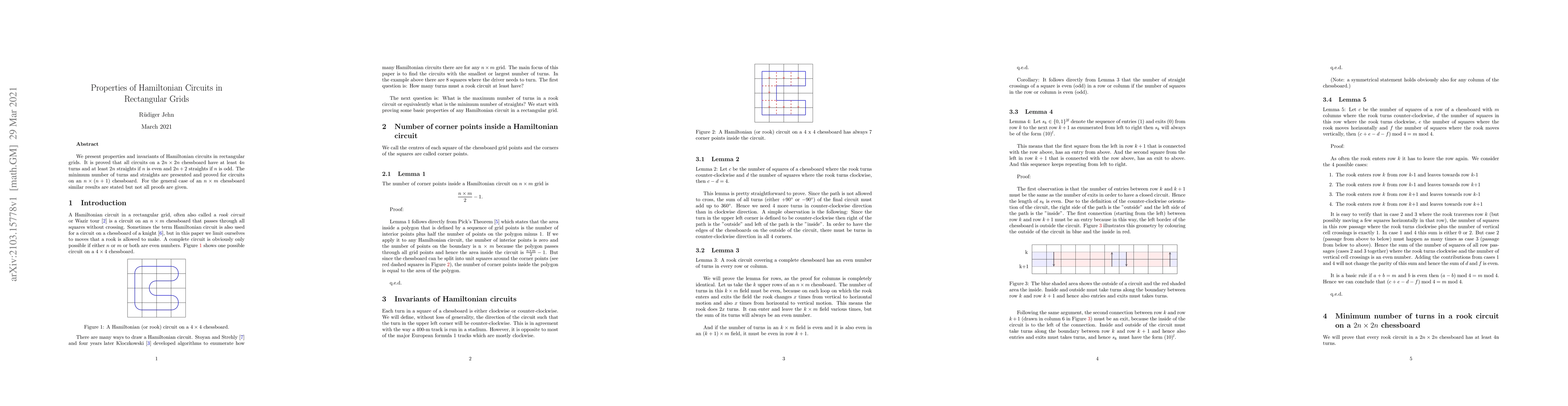 This paper explores the properties of Hamiltonian circuits in rectangular grids, proving that $2n \times 2n$ chessboards require at least $4n$ turns and $2n$ straights for even $n$, or $2n+2$ straights for odd $n$. It also presents minimum turn and straight counts for $n \times (n+1)$ grids, with similar results for $n \times m$ grids suggested but not fully proven.