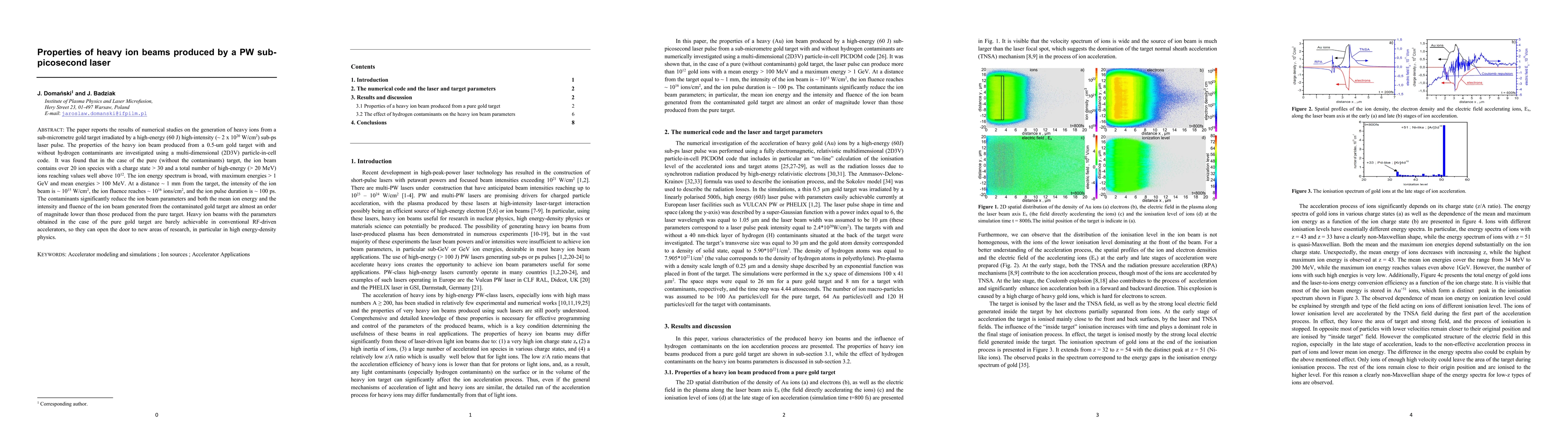 The paper reports the results of numerical studies on the generation of heavy ions from a sub-micrometre gold target irradiated by a high-energy (60 J) high-intensity (~ 2 x 10^20 W/cm2) sub-ps laser pulse. The properties of the heavy ion beam produced from a 0.5-um gold target with and without hydrogen contaminants are investigated using a multi-dimensional (2D3V) particle-in-cell code. It was found that in the case of the pure (without the contaminants) target, the ion beam contains over 20 ion species with a charge state > 30 and a total number of high-energy (> 20 MeV) ions reaching values well above 10^12. The ion energy spectrum is broad, with maximum energies > 1 GeV and mean energies > 100 MeV. At a distance ~ 1 mm from the target, the intensity of the ion beam is ~ 10^15 W/cm2, the ion fluence reaches ~ 10^16 ions/cm2, and the ion pulse duration is ~ 100 ps. The contaminants significantly reduce the ion beam parameters and both the mean ion energy and the intensity and fluence of the ion beam generated from the contaminated gold target are almost an order of magnitude lower than those produced from the pure target. Heavy ion beams with the parameters obtained in the case of the pure gold target are barely achievable in conventional RF-driven accelerators, so they can open the door to new areas of research, in particular in high energy-density physics.