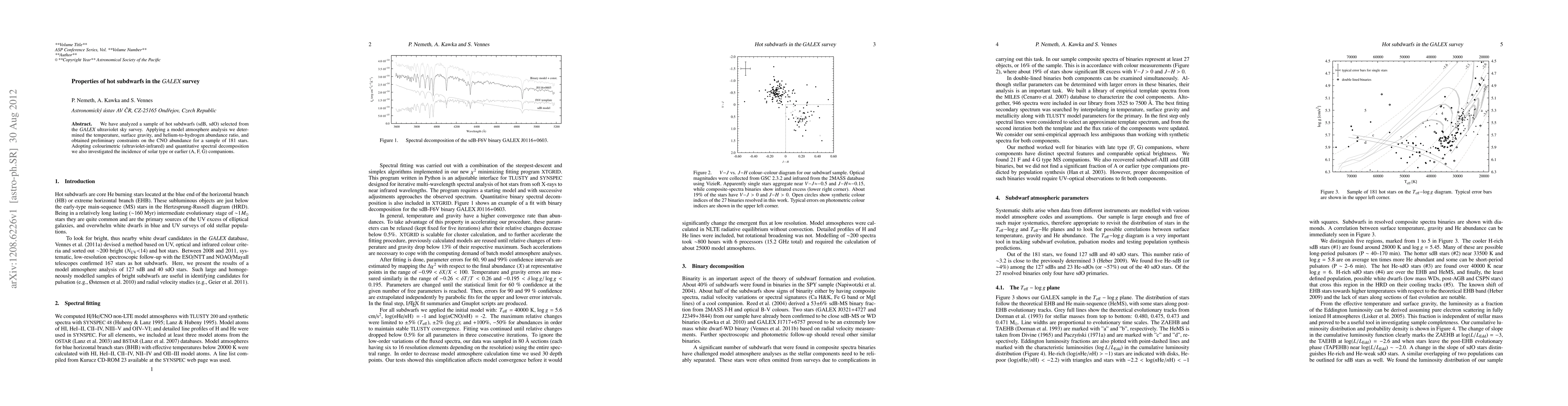 We have analyzed a sample of hot subdwarfs (sdB, sdO) selected from the GALEX ultraviolet sky survey. Applying a model atmosphere analysis we determined the temperature, surface gravity, and helium-to-hydrogen abundance ratio, and obtained preliminary constraints on the CNO abundance for a sample of 181 stars. Adopting colourimetric (ultraviolet-infrared) and quantitative spectral decomposition we also investigated the incidence of solar type or earlier (A, F, G) companions.