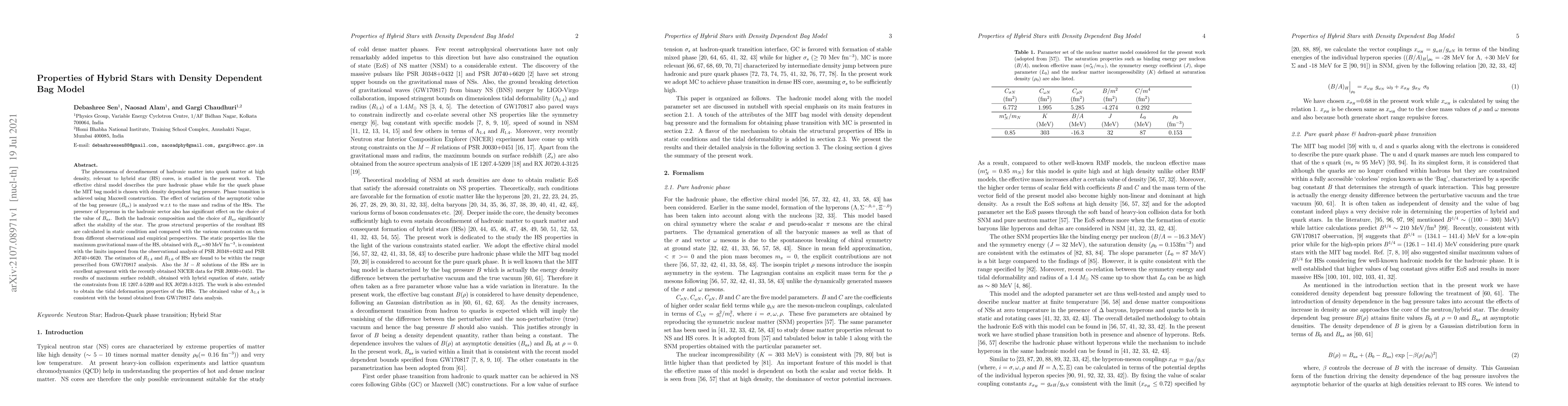The phenomena of deconfinement of hadronic matter into quark matter at high density, relevant to hybrid star (HS) cores, is studied in the present work. The effective chiral model describes the pure hadronic phase while for the quark phase the MIT bag model is chosen with density dependent bag pressure. Phase transition is achieved using Maxwell construction. The effect of variation of the asymptotic value of the bag pressure ($B_{as}$) is analyzed w.r.t to the mass and radius of the HSs. The presence of hyperons in the hadronic sector also has significant effect on the choice of the value of $B_{as}$. Both the hadronic composition and the choice of $B_{as}$ significantly affect the stability of the star. The gross structural properties of the resultant HS are calculated in static condition and compared with the various constraints on them from different observational and empirical perspectives. The static properties like the maximum gravitational mass of the HS, obtained with $B_{as}$=80 MeV fm$^{-3}$, is consistent with the limits imposed from the observational analysis of PSR J0348+0432 and PSR J0740+6620. The estimates of $R_{1.4}$ and $R_{1.6}$ of HSs are found to be within the range prescribed from GW170817 analysis. Also the $M-R$ solutions of the HSs are in excellent agreement with the recently obtained NICER data for PSR J0030+0451. The results of maximum surface redshift, obtained with hybrid equation of state, satisfy the constraints from 1E 1207.4-5209 and RX J0720.4-3125. The work is also extended to obtain the tidal deformation properties of the HSs. The obtained value of $\Lambda_{1.4}$ is consistent with the bound obtained from GW170817 data analysis.