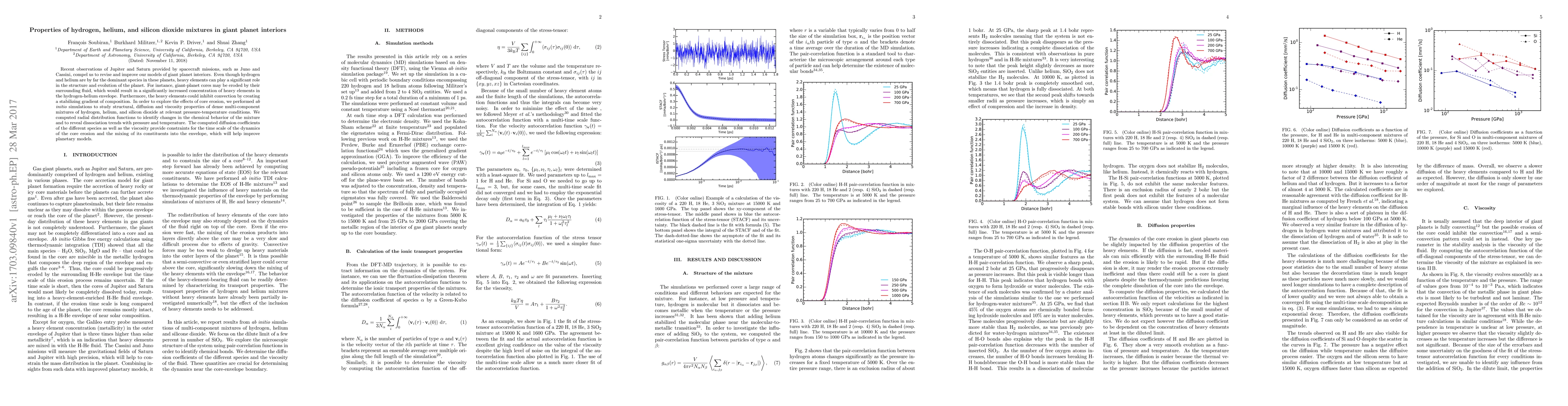 This paper investigates the structural, diffusion, and viscosity properties of dense mixtures of hydrogen, helium, and silicon dioxide under the extreme conditions found in the interiors of giant planets. The study aims to understand the impact of heavy elements on the planet's dynamics and evolution, particularly in the context of core erosion and compositional gradients.