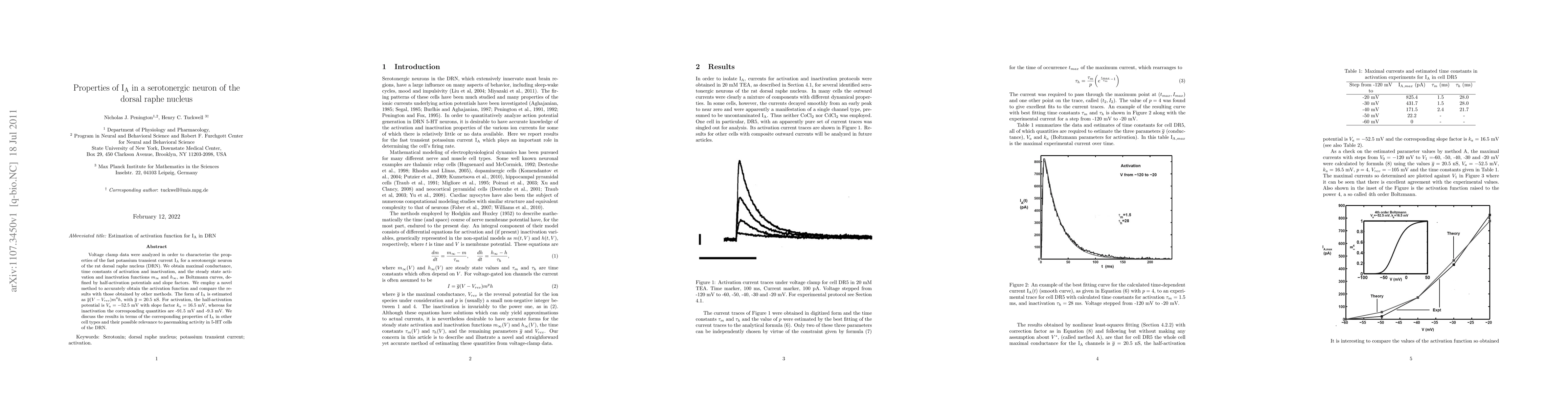 This study characterizes the fast potassium transient current IA in serotonergic neurons of the rat dorsal raphe nucleus, determining its maximal conductance, activation and inactivation time constants, and steady-state functions. The results suggest IA's potential role in pacemaking activity in these neurons.