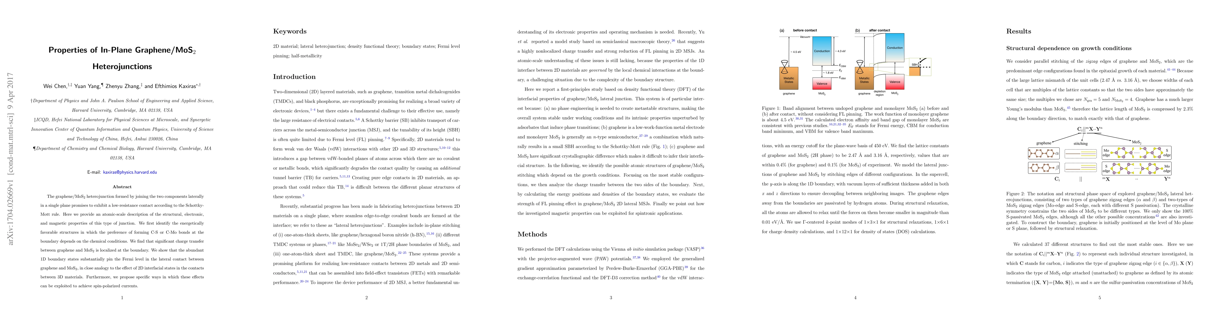 This research details the atomic-scale properties of graphene/MoS2 lateral heterojunctions, revealing favorable structures based on chemical conditions and significant charge transfer at the boundary. It highlights how abundant 1D boundary states pin the Fermi level, akin to 2D interfacial states in 3D materials, and proposes methods for generating spin-polarized currents.
