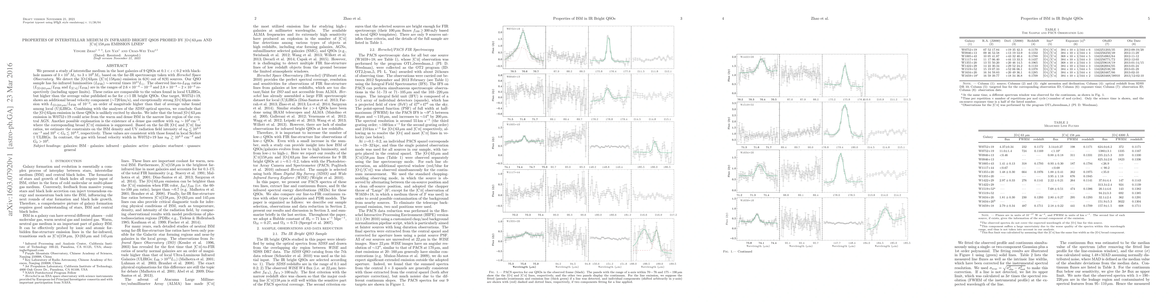 This study uses far-infrared spectroscopy to examine the interstellar medium in host galaxies of 9 quasars, revealing line emissions similar to local ultra-luminous infrared galaxies and indicating dense, warm gas possibly influenced by active galactic nuclei. The findings suggest that the properties of interstellar gas in these quasars are comparable to those in local Seyfert galaxies, with some cases showing signs of dense gas outflows.