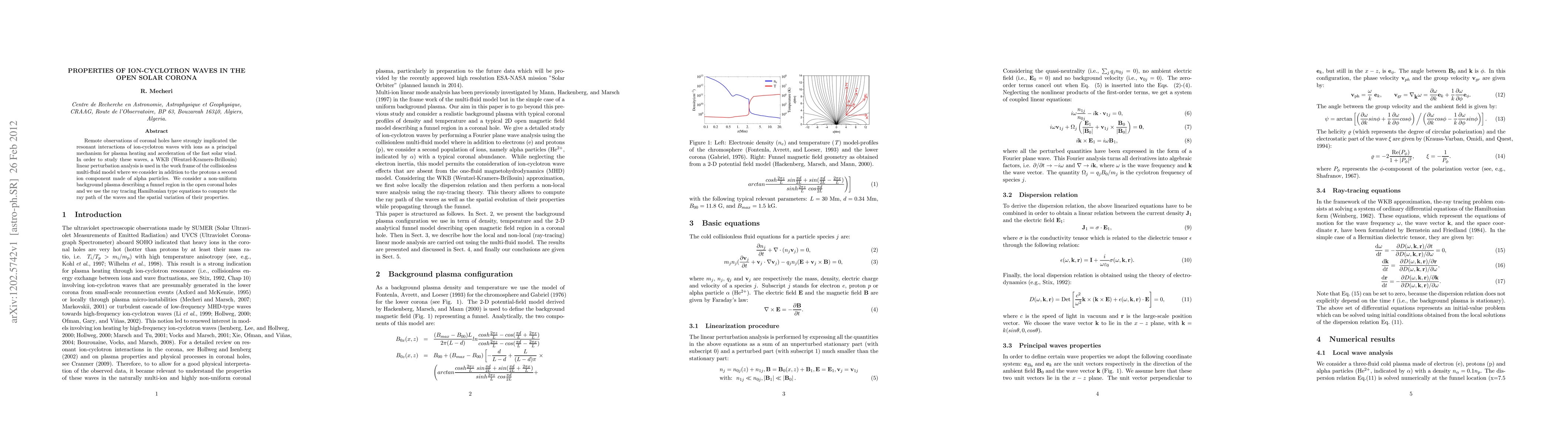 This paper investigates the properties of ion-cyclotron waves in the open solar corona using a WKB linear perturbation analysis within a multi-fluid model, focusing on their role in plasma heating and solar wind acceleration. Ray tracing Hamiltonian equations are employed to analyze the wave's propagation and spatial variations in a non-uniform plasma environment.