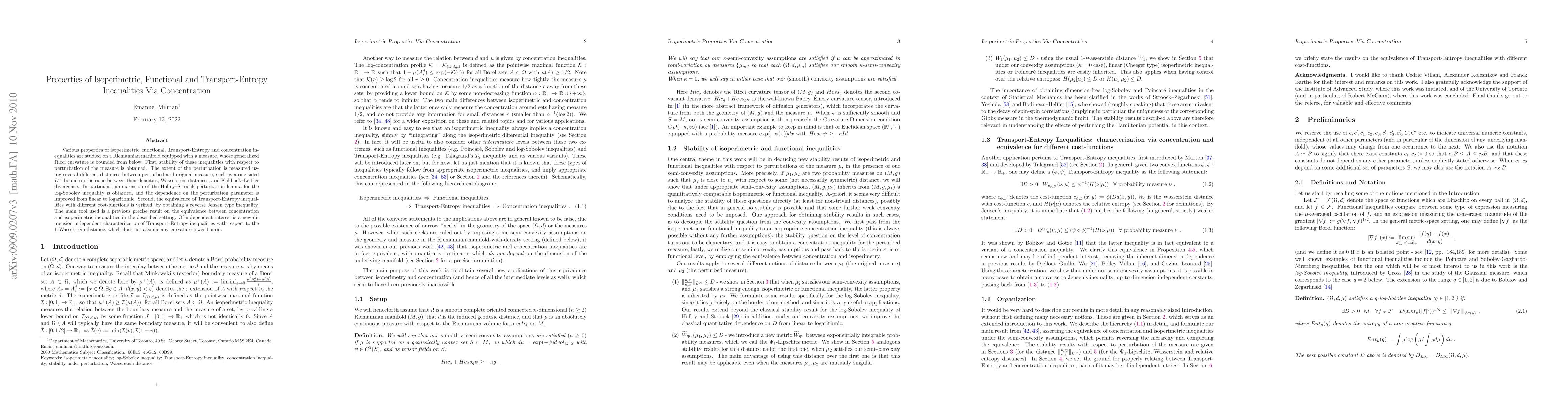 This paper investigates properties of isoperimetric, functional, and Transport-Entropy inequalities on Riemannian manifolds with bounded Ricci curvature. It establishes stability of these inequalities under measure perturbations and improves the perturbation dependence from linear to logarithmic. Additionally, it verifies the equivalence of Transport-Entropy inequalities with different cost-functions and provides a new dimension-independent characterization of these inequalities.
