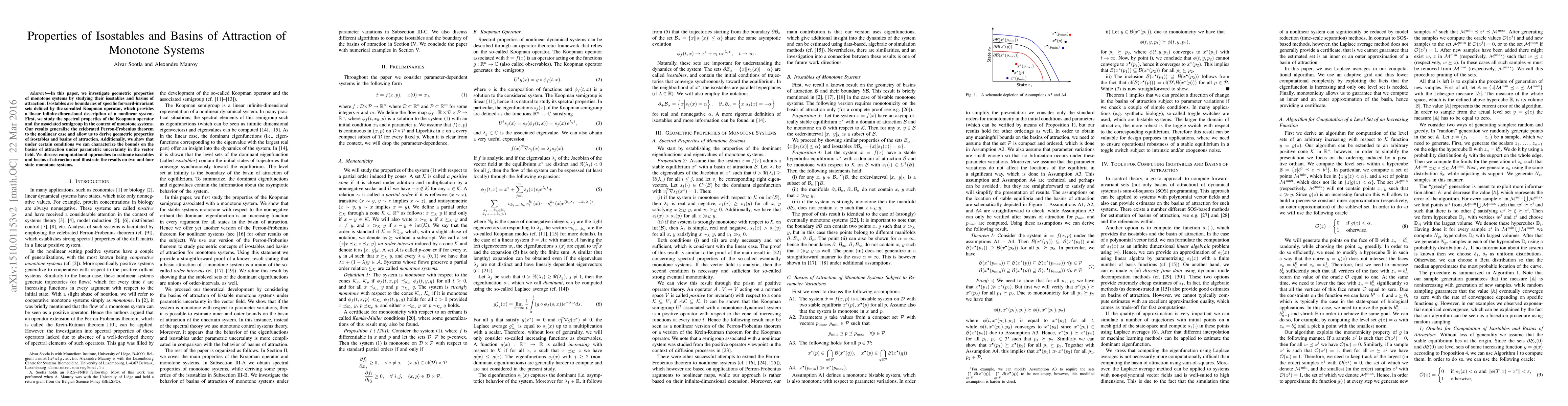 This paper explores the geometric properties of monotone systems through their isostables and basins of attraction, generalizing the Perron-Frobenius theorem to nonlinear systems. It also characterizes bounds on basins of attraction under parametric uncertainty and discusses computational methods for estimating these properties.