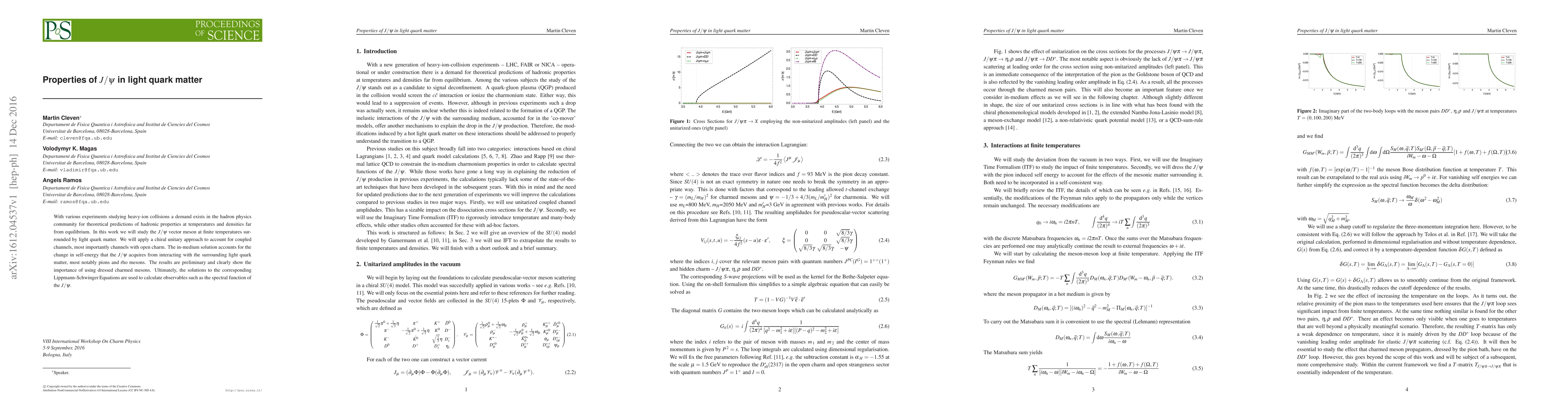 With various experiments studying heavy-ion collisions a demand exists in the hadron physics community for theoretical predictions of hadronic properties at temperatures and densities far from equilibrium. In this work we will study the $J/\psi$ vector meson at finite temperatures surrounded by light quark matter. We will apply a chiral unitary approach to account for coupled channels, most importantly channels with open charm. The in-medium solution accounts for the change in self-energy that the $J/\psi$ acquires from interacting with the surrounding light quark matter, most notably pions and rho mesons. The results are preliminary and clearly show the importance of using dressed charmed mesons. Ultimately, the solutions to the corresponding Lippmann-Schwinger Equations are used to calculate observables such as the spectral function of the $J/\psi$.