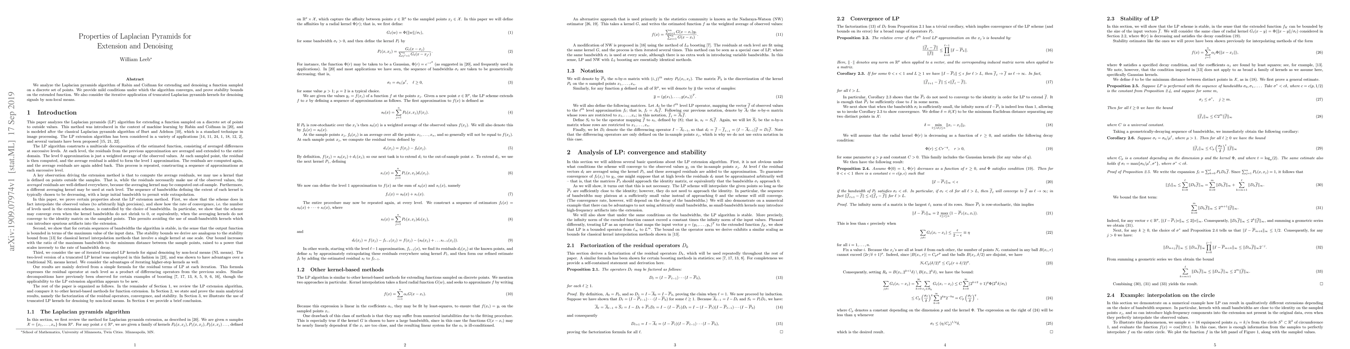 We analyze the Laplacian pyramids algorithm of Rabin and Coifman for extending and denoising a function sampled on a discrete set of points. We provide mild conditions under which the algorithm converges, and prove stability bounds on the extended function. We also consider the iterative application of truncated Laplacian pyramids kernels for denoising signals by non-local means.