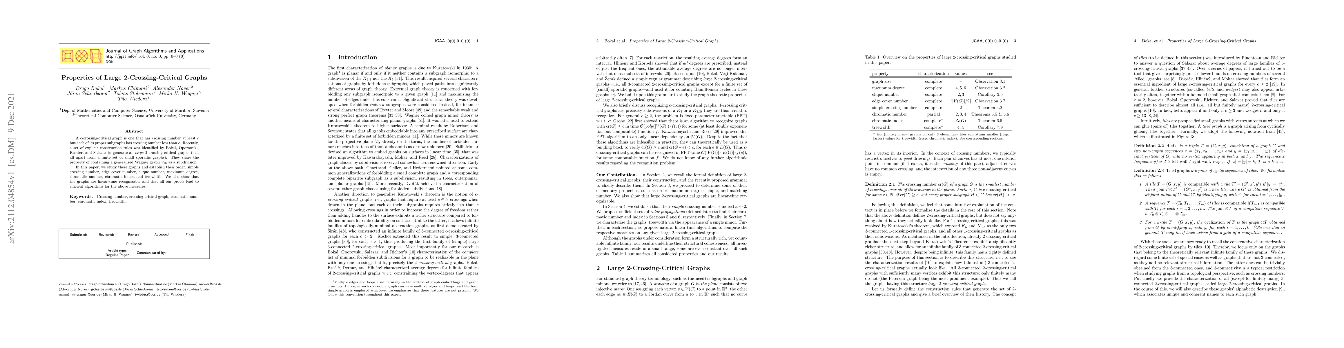 This paper investigates large 2-crossing-critical graphs, characterized by containing a generalized Wagner graph $V_{10}$ as a subdivision, and provides explicit construction rules. It establishes various graph properties including order, crossing number, edge cover number, and chromatic indices, and demonstrates that these graphs are linear-time recognizable with efficient algorithms for these measures.