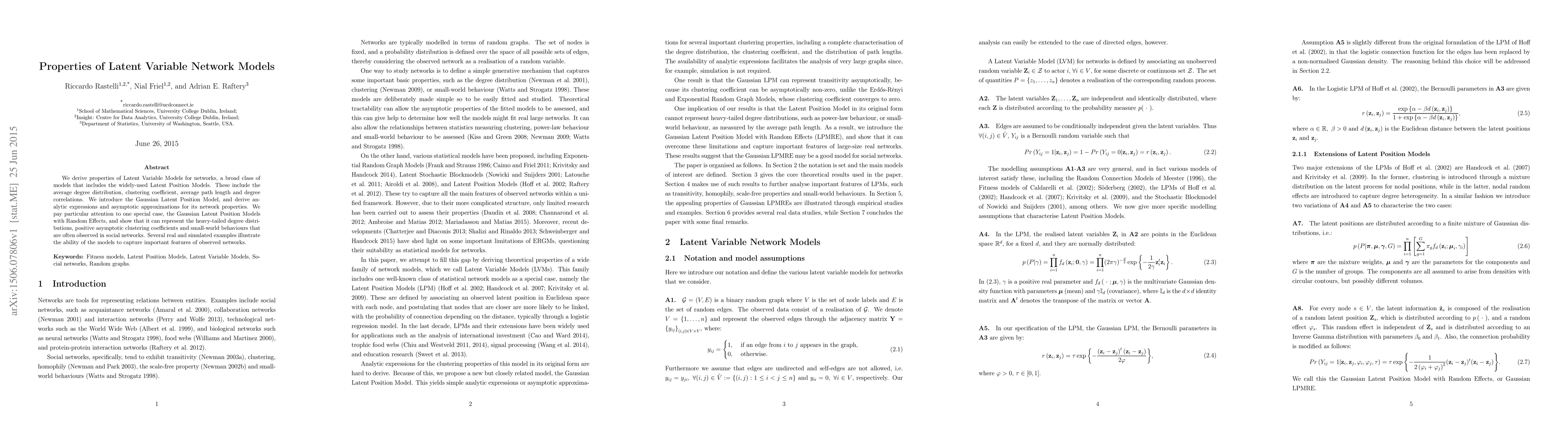 The research derives properties of Latent Variable Models for networks, focusing on Gaussian Latent Position Models (LPMs), including average degree distribution, clustering coefficient, average path length, and degree correlations. It introduces the Gaussian LPM and provides analytic expressions and asymptotic approximations for its network properties.