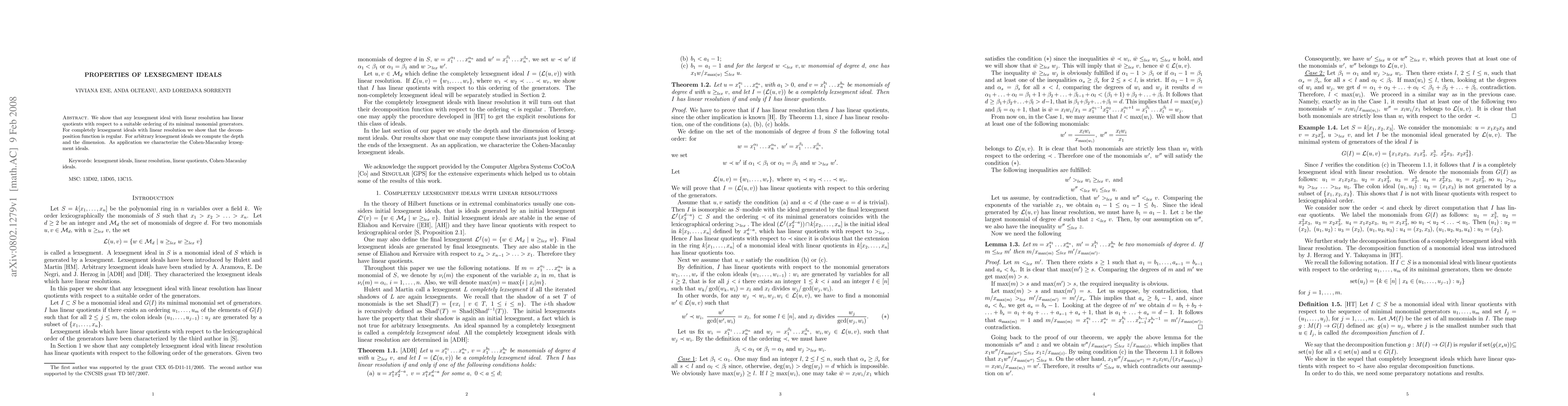This paper investigates properties of lexsegment ideals, proving that those with linear resolution have linear quotients under a specific ordering. It further demonstrates that completely lexsegment ideals with linear resolution have regular decomposition functions and computes depth and dimension for arbitrary lexsegment ideals, concluding with a characterization of Cohen-Macaulay lexsegment ideals.
