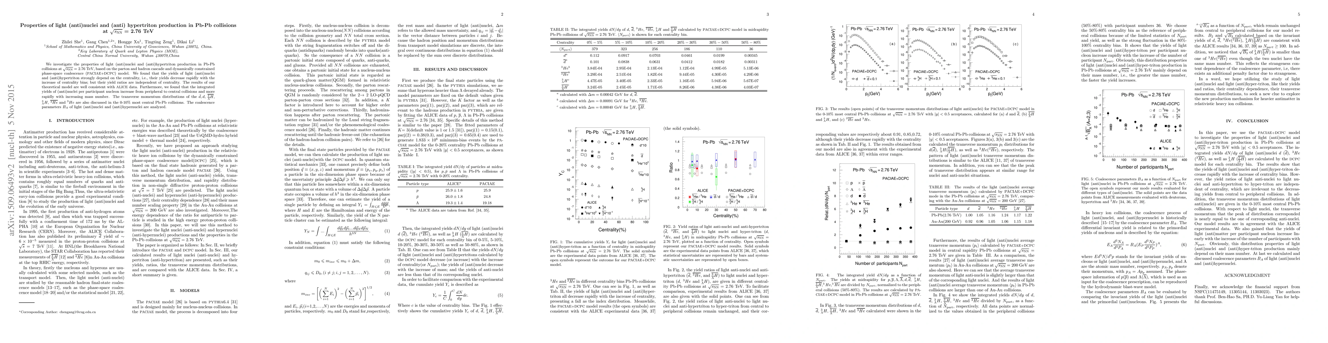 We investigate the properties of light (anti)nuclei and (anti)hypertriton production in Pb-Pb collisions at $\sqrt{s_{\rm{NN}}}=2.76$ TeV, based on the parton and hadron cascade and dynamically constrained phase-space coalescence (PACIAE + DCPC) model. We found that the yields of light (anti)nuclei and (anti)hypertriton strongly depend on the centrality, i.e., their yields decrease rapidly with the increase of centrality bins, but their yield ratios are independent of centrality. The results of theoretical model are well consistent with ALICE data. Furthermore, we found that the integrated yields of (anti)nuclei per participant nucleon increase from peripheral to central collisions more rapidly with increasing mass number. The transverse momentum distributions of $\overline{_{\overline\Lambda}^3 H}, {_{\Lambda}^3 H},{\overline{^3 He}}$ and $^3{{He}}$ are also discussed in the 0-10% most central Pb-Pb collisions.The coalescence parameters $B_A$ of light (anti)nuclei and (anti)hypernuclei are analyzed.
