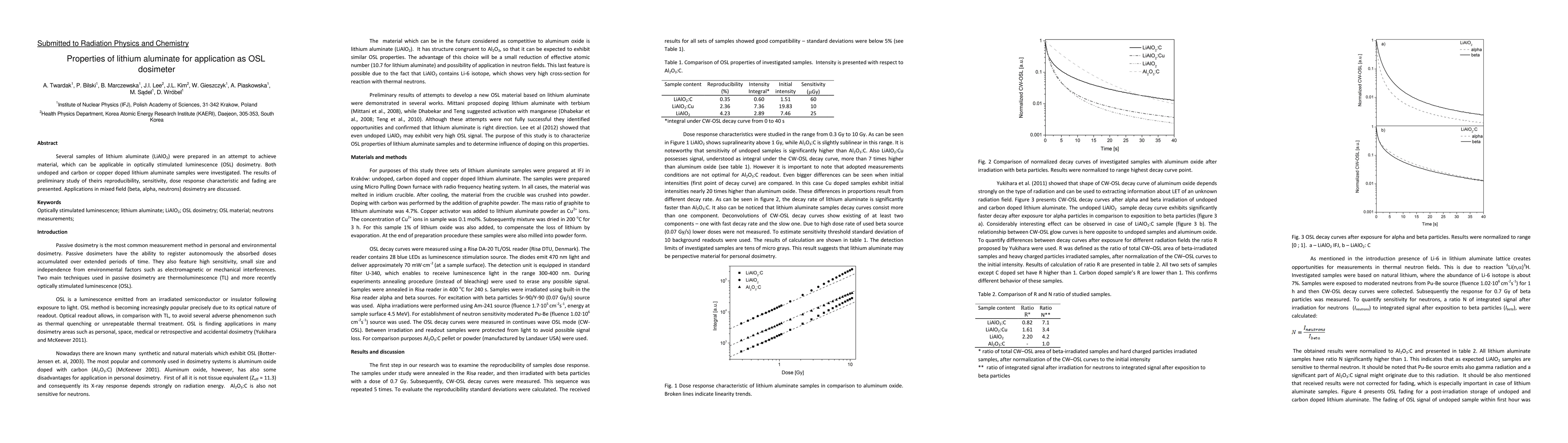 This study investigates the properties of lithium aluminate (LiAlO2) samples, both undoped and doped with carbon or copper, for use as optically stimulated luminescence dosimeters. The research evaluates their reproducibility, sensitivity, dose response, and fading characteristics, with potential applications in mixed-field dosimetry.