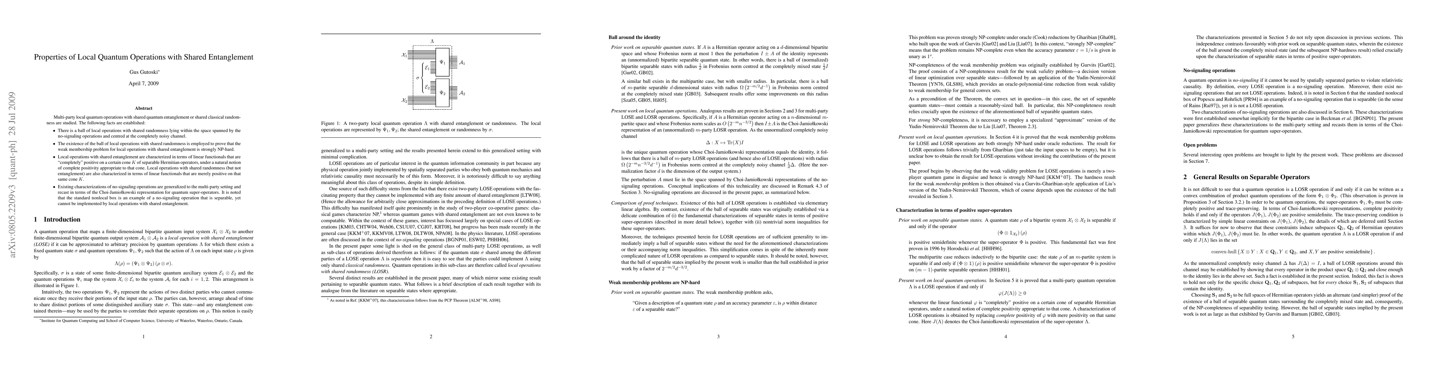 Multi-party local quantum operations with shared quantum entanglement or shared classical randomness are studied. The following facts are established: (i) There is a ball of local operations with shared randomness lying within the space spanned by the no-signaling operations and centred at the completely noisy channel. (ii) The existence of the ball of local operations with shared randomness is employed to prove that the weak membership problem for local operations with shared entanglement is strongly NP-hard. (iii) Local operations with shared entanglement are characterized in terms of linear functionals that are ``completely'' positive on a certain cone K of separable Hermitian operators, under a natural notion of complete positivity appropriate to that cone. Local operations with shared randomness (but not entanglement) are also characterized in terms of linear functionals that are merely positive on that same cone K. (iv) Existing characterizations of no-signaling operations are generalized to the multi-party setting and recast in terms of the Choi-Jamiolkowski representation for quantum super-operators. It is noted that the standard nonlocal box is an example of a no-signaling operation that is separable, yet cannot be implemented by local operations with shared entanglement.