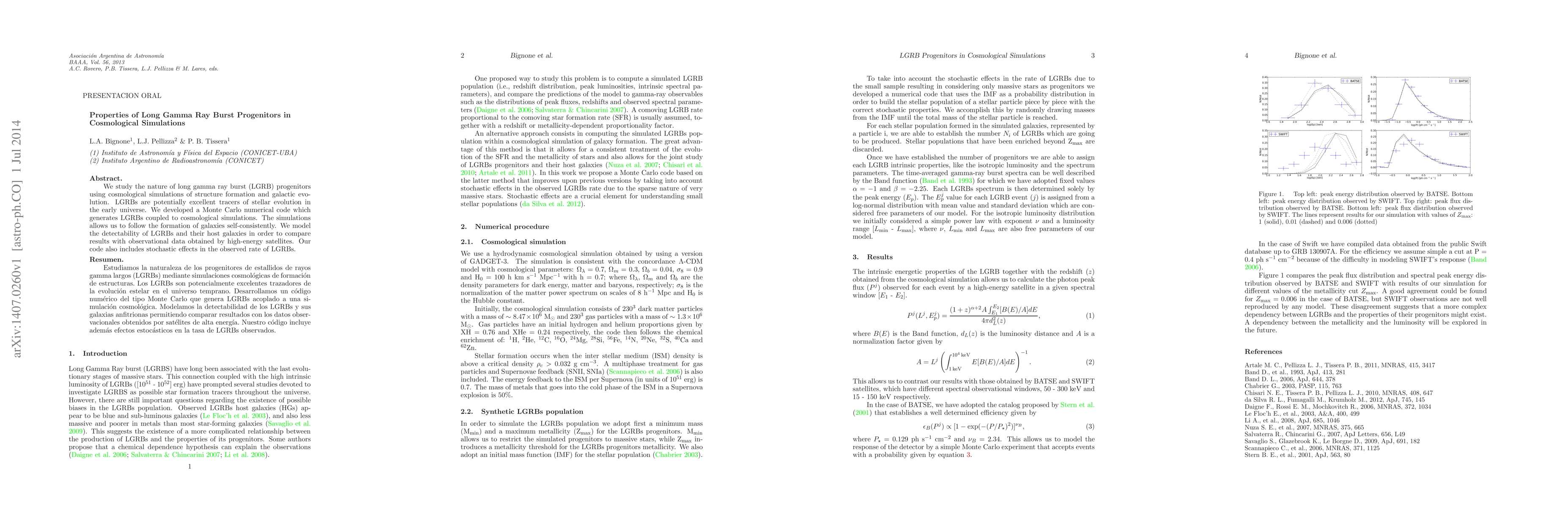 We study the nature of long gamma ray burst (LGRB) progenitors using cosmological simulations of structure formation and galactic evolution. LGRBs are potentially excellent tracers of stellar evolution in the early universe. We developed a Monte Carlo numerical code which generates LGRBs coupled to cosmological simulations. The simulations allows us to follow the ormation of galaxies self-consistently. We model the detectability of LGRBs and their host galaxies in order to compare results with observational data obtained by high-energy satellites. Our code also includes stochastic effects in the observed rate of LGRBs.