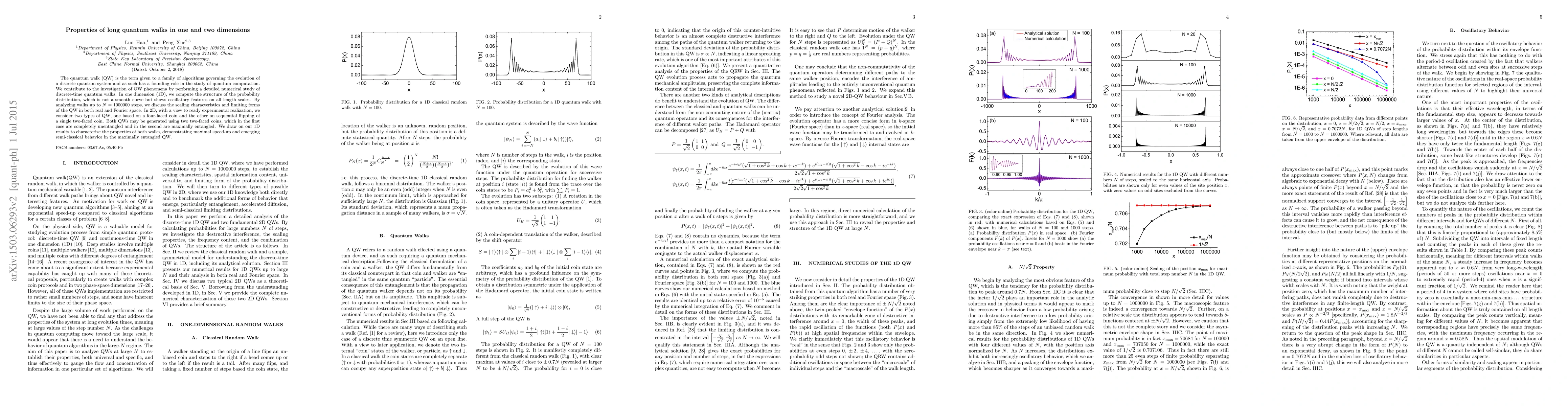 The quantum walk (QW) is the term given to a family of algorithms governing the evolution of a discrete quantum system and as such has a founding role in the study of quantum computation. We contribute to the investigation of QW phenomena by performing a detailed numerical study of discrete-time quantum walks. In one dimension (1D), we compute the structure of the probability distribution, which is not a smooth curve but shows oscillatory features on all length scales. By analyzing walks up to $N$ = 1000000 steps, we discuss the scaling characteristics and limiting forms of the QW in both real and Fourier space. In 2D, with a view to ready experimental realization, we consider two types of QW, one based on a four-faced coin and the other on sequential flipping of a single two-faced coin. Both QWs may be generated using two two-faced coins, which in the first case are completely unentangled and in the second are maximally entangled. We draw on our 1D results to characterize the properties of both walks, demonstrating maximal speed-up and emerging semi-classical behavior in the maximally entangled QW.